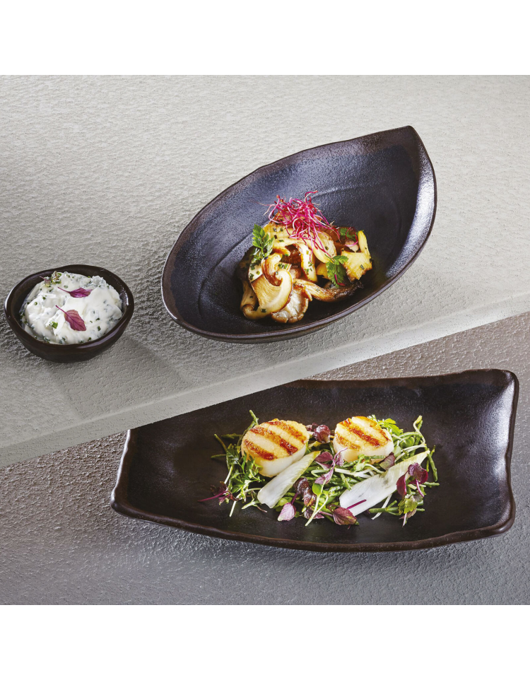 La struttura superficiale ruvida crea un aspetto naturale. Le ciotole e i vassoi neri con bordo marrone mettono in scena le pietanze in modo molto elegante. Una perfetta imitazione di argilla, con bordo marrone. Superficie interna ed esterna finemente opaca e con effetto argilla al tatto.