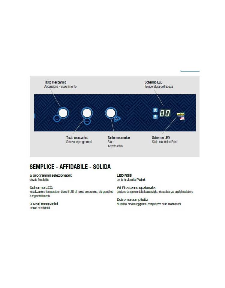 Interfaccia utente costituita da tre robusti pulsanti meccanici per la gestione della lavastoviglie (accensione/spegnimento, avvio e stop del programma di lavaggio, selezione programma piatti o bicchieri) e da uno schermo LED che visualizza la temperature dell’acqua di lavaggio/risciacquo, supporta l’utente nel lavoro quotidiano grazie alla semplicità di utilizzo.