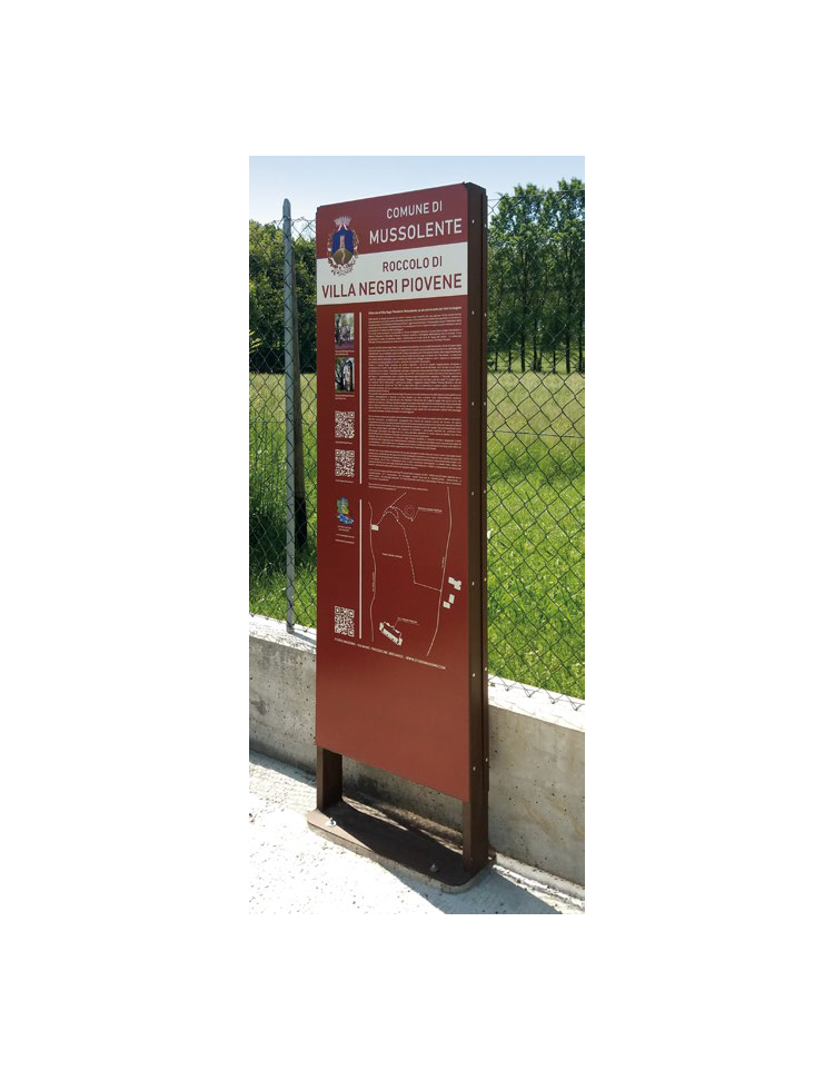 Leggio di dimensioni 602×250 mm composto da un telaio e da due pannelli espositivi (la grafica non è compresa nel prezzo). Il telaio è realizzato in tubo rettangolare con alla base una piastra tagliata a tecnologia laser con la predisposizione di fori per il tassellamento al suolo del leggio. I pannelli espositivi di dimensioni 602×1702 mm sono realizzati in lamiera opportunamente piegata e successivamente fissata con viti nella parte laterale e all’estremità superiore e inferiore del telaio. Tutti i componenti sono in acciaio zincato e verniciato a polveri poliestere termoindurenti nelle diverse colorazioni RAL. La viteria è in acciaio inox. Adatto per il posizionamento lungo percorsi naturalistici o ciclabili, all’esterno di luoghi di interesse. E’ perfetto per l’applicazione di pellicole con descrizioni turistiche o informative.