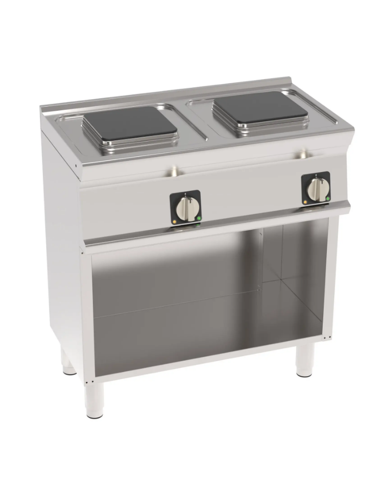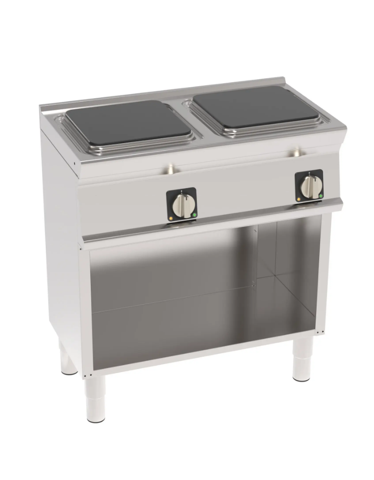 • Cucina elettrica acciaio inox su vano aperto, 2 piastre ermetiche quadrate cm 22x22 - potenza tot Kw 5,2 trifase - cm 80x45x90h Cucina elettrica acciaio inox su vano aperto, 2 piastre ermetiche quadrate cm 22x22 - potenza tot Kw 5,2 trifase - cm 80x45x90h