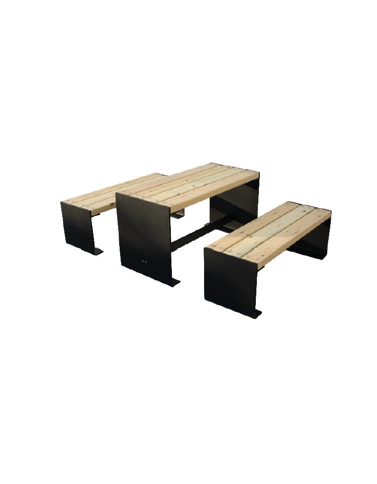 Mini set con panchine senza schienale legno pregio. Set con struttura portante in acciaio zincato e verniciato nelle varie colorazioni RAL. I fianchi del tavolo e delle panchine sono costituiti da due robuste spalle laterali in lamiera di acciaio sulle quali sono saldate le piastre base per poter fissare la struttura al suolo con tasselli ad espansione. Nella parte superiore dei supporti sono saldate le piastre dove sono fissate le doghe in legno. Le sedute ed il piano del tavolo sono formati da doghe in legno di pregio di grosso spessore. Per dare stabilità alla seduta centralmente è fissato tramite viti un tirante di rinforzo. La viteria è interamente in acciaio inox