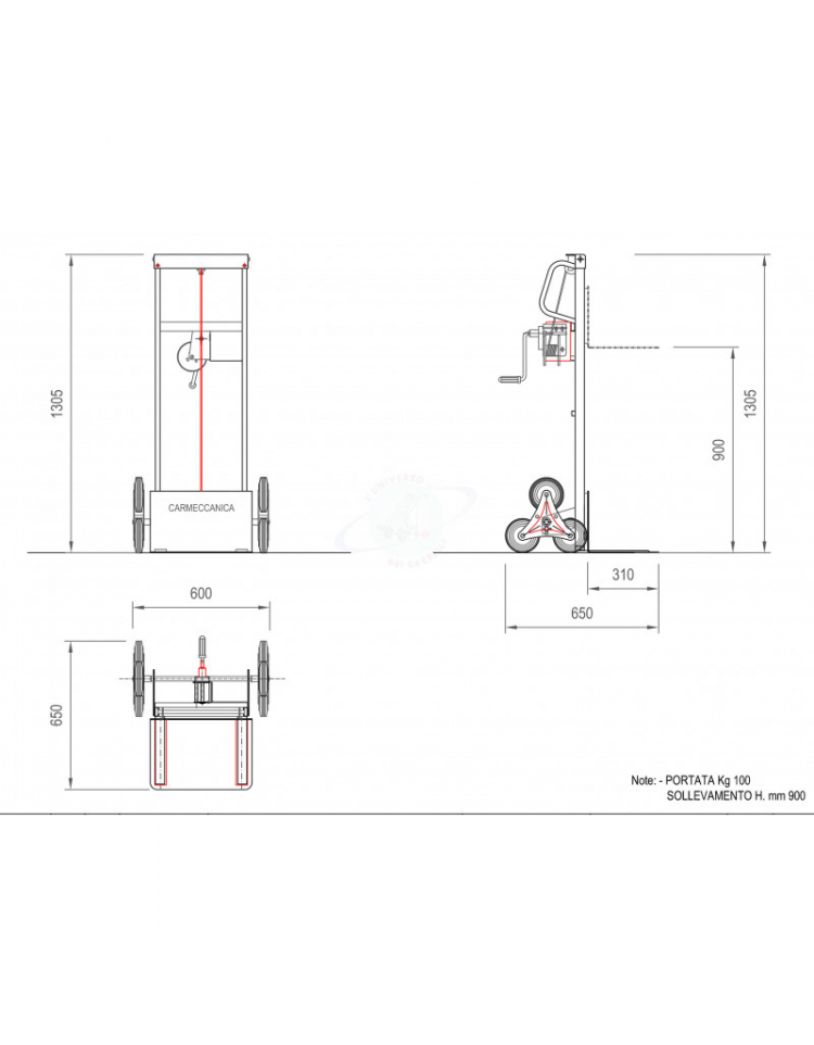L'esclusivo argano a manovella permette di sollevare carico fino a 100 Kg e a 950 mm di altezza, col minimo sforzo e attraverso la frizione automatica incorporata si può bloccare la salita in qualsiasi punto nel sollevamento. La discesa del carico può avvenire solo se l'operatore agisce sull'argano.