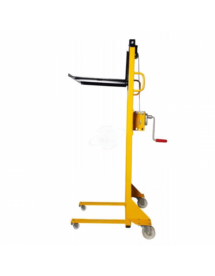 L'esclusivo argano a manovella permette di sollevare il carico fino a 120 Kg e a 1200 mm di altezza, col minimo sforzo e attraverso la frizione automatica incorporata si può bloccare la salita in qualsiasi punto nel sollevamento. La discesa del carico può avvenire solo se l'operatore agisce sull'argano.