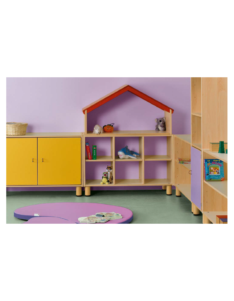 I mobili contenitori compongono un sistema modulare ricco di elementi flessibili e dinamici, in grado di creare angoli e pareti divisorie. La schiena, a vista, è attrezzabile con specchi, pannelli in sughero e lavagne. I mobili sono completamente smontabili e le varie parti che li compongono sono sostituibili separatamente: questa caratteristica prolunga il tempo di utilizzo degli arredi e ne facilita la dismissione a fine ciclo di vita. I bordi, in ABS, sono arrotondati e verniciati al naturale. Le ante sono dotate di feltrini antirumore in battuta e le maniglie sono disponibili sia in legno sia in cuoio antitrauma. Linee pulite e colori chiari per rispondere alle esigenze di una buona pedagogia con un design moderno e minimale. Bordi in rovere sbiancato, ante e ripiani a giorno a filo con la struttura, maniglie essenziali e piedi squadrati rinnovano la linea dei mobili. Tutti possono essere messi su ruote dotate di sistema di bloccaggio. Finitura della struttura e dei piani in laminato color latte antriflesso. Ante a filo per aumentare il pregio estetico e la linearità delle composizioni d’arredo. Nuovo bordo tridimensionale in rilievo, per sottolineare la percezione materica del mobile.