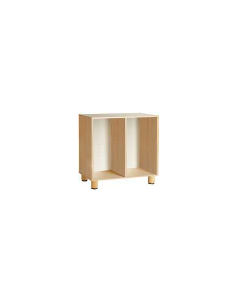 La struttura composta da base, fiancate, divisioni, ripiani regolabili e top, è realizzata in forma mista, la base è in pannelli di legno multistrati di betulla da mm 20 di spessore, le fiancate e il top sono in conglomerato ligneo in classe E1 di emissione di formaldeide da mm 20 di spessore, la finitura di tutta la struttura è in nobilitato betulla finitura seta o in nobilitato larice con venatura a vista e a rilievo, i bordi sono realizzati in abs da 2 mm di spessore e arrotondati nel rispetto della normativa di sicurezza vigente. Lo schienale è realizzato in pannelli di conglomerato ligneo nobilitato magnolia da mm 10 di spessore inserito a incastro nelle opportune sedi ricavate sulla base, sulle fiancate e sul top. L'appoggio a terra è ottenuto tramite l'utilizzo di 4 piedini realizzati in legno massello di faggio tornito da mm 60 di diametro e 100 di altezza, lucidato al naturale con vernici atossiche trasparenti a base d'acqua, alla base dei piedini sono collocati dei puntali regolabili antirumore realizzati in abs. Gli assemblaggi sono realizzati tramite sistema meccanico di bussole in acciaio (preventivamente alloggiate a incasso nelle opportune sedi) e tiranti in acciaio che garantiscono la massima tenuta a fronte di una semplice disassemblabilità in caso di manutenzione o sostituzione di singole parti del mobile. Oltre a bussole e tiranti, l'assemblaggio prevede anche l'utilizzo di spinotti in legno per garantire ulteriore stabilità e tenuta.