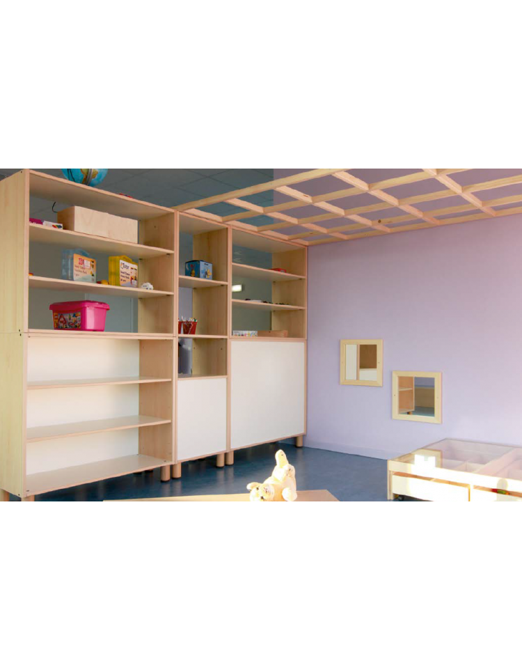 I mobili contenitori compongono un sistema modulare ricco di elementi flessibili e dinamici, in grado di creare angoli e pareti divisorie. La schiena, a vista, è attrezzabile con specchi, pannelli in sughero e lavagne. I mobili sono completamente smontabili e le varie parti che li compongono sono sostituibili separatamente: questa caratteristica prolunga il tempo di utilizzo degli arredi e ne facilita la dismissione a fine ciclo di vita. I bordi, in ABS, sono arrotondati e verniciati al naturale. Le ante sono dotate di feltrini antirumore in battuta e le maniglie sono disponibili sia in legno sia in cuoio antitrauma. Linee pulite e colori chiari per rispondere alle esigenze di una buona pedagogia con un design moderno e minimale. Bordi in rovere sbiancato, ante e ripiani a giorno a filo con la struttura, maniglie essenziali e piedi squadrati rinnovano la linea dei mobili. Tutti possono essere messi su ruote dotate di sistema di bloccaggio. Finitura della struttura e dei piani in laminato color latte antriflesso. Ante a filo per aumentare il pregio estetico e la linearità delle composizioni d’arredo. Nuovo bordo tridimensionale in rilievo, per sottolineare la percezione materica del mobile.