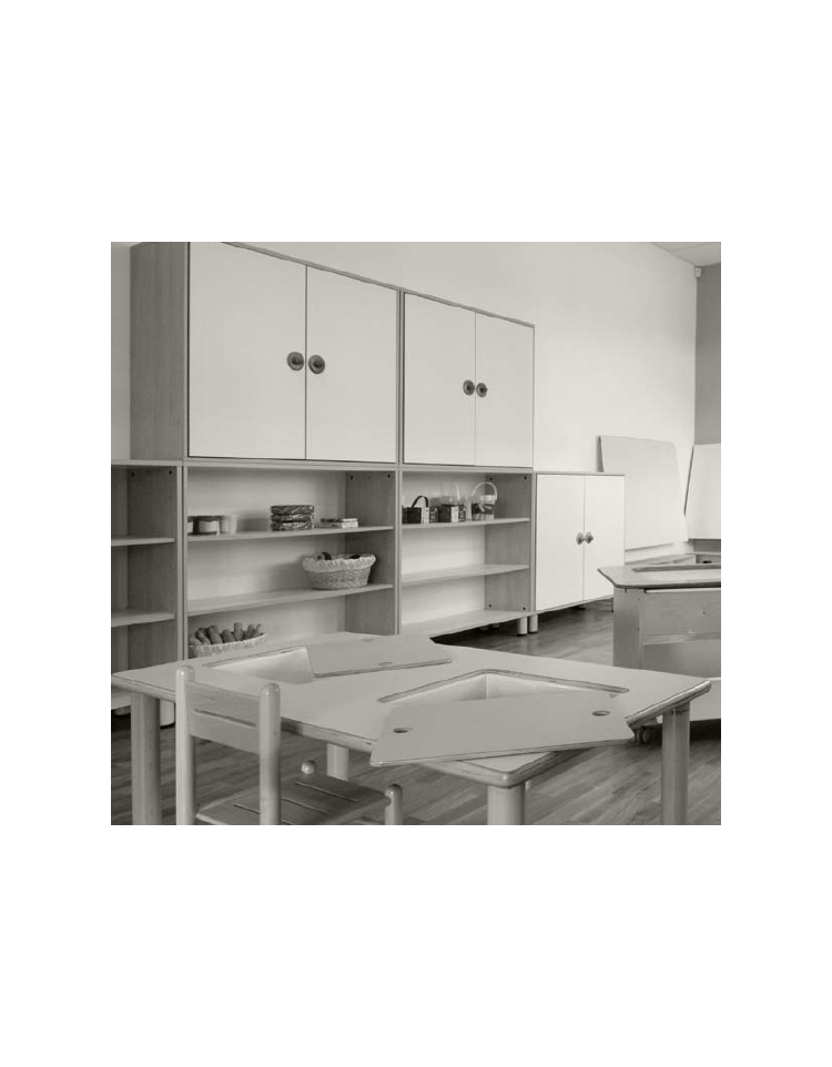 I mobili contenitori compongono un sistema modulare ricco di elementi flessibili e dinamici, in grado di creare angoli e pareti divisorie. La schiena, a vista, è attrezzabile con specchi, pannelli in sughero e lavagne. I mobili sono completamente smontabili e le varie parti che li compongono sono sostituibili separatamente: questa caratteristica prolunga il tempo di utilizzo degli arredi e ne facilita la dismissione a fine ciclo di vita. I bordi, in ABS, sono arrotondati e verniciati al naturale. Le ante sono dotate di feltrini antirumore in battuta e le maniglie sono disponibili sia in legno sia in cuoio antitrauma. Linee pulite e colori chiari per rispondere alle esigenze di una buona pedagogia con un design moderno e minimale. Bordi in rovere sbiancato, ante e ripiani a giorno a filo con la struttura, maniglie essenziali e piedi squadrati rinnovano la linea dei mobili. Tutti possono essere messi su ruote dotate di sistema di bloccaggio. Finitura della struttura e dei piani in laminato color latte antriflesso. Ante a filo per aumentare il pregio estetico e la linearità delle composizioni d’arredo. Nuovo bordo tridimensionale in rilievo, per sottolineare la percezione materica del mobile.