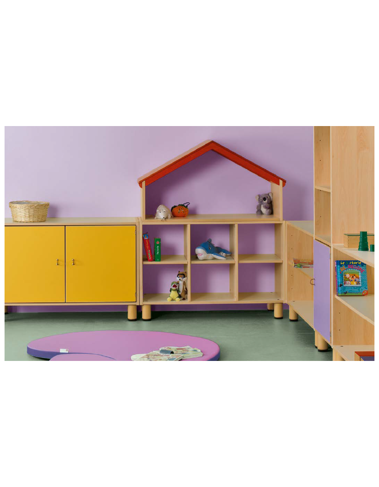 I mobili contenitori compongono un sistema modulare ricco di elementi flessibili e dinamici, in grado di creare angoli e pareti divisorie. La schiena, a vista, è attrezzabile con specchi, pannelli in sughero e lavagne. I mobili sono completamente smontabili e le varie parti che li compongono sono sostituibili separatamente: questa caratteristica prolunga il tempo di utilizzo degli arredi e ne facilita la dismissione a fine ciclo di vita. I bordi, in ABS, sono arrotondati e verniciati al naturale. Le ante sono dotate di feltrini antirumore in battuta e le maniglie sono disponibili sia in legno sia in cuoio antitrauma. Linee pulite e colori chiari per rispondere alle esigenze di una buona pedagogia con un design moderno e minimale. Bordi in rovere sbiancato, ante e ripiani a giorno a filo con la struttura, maniglie essenziali e piedi squadrati rinnovano la linea dei mobili. Tutti possono essere messi su ruote dotate di sistema di bloccaggio. Finitura della struttura e dei piani in laminato color latte antriflesso. Ante a filo per aumentare il pregio estetico e la linearità delle composizioni d’arredo. Nuovo bordo tridimensionale in rilievo, per sottolineare la percezione materica del mobile.