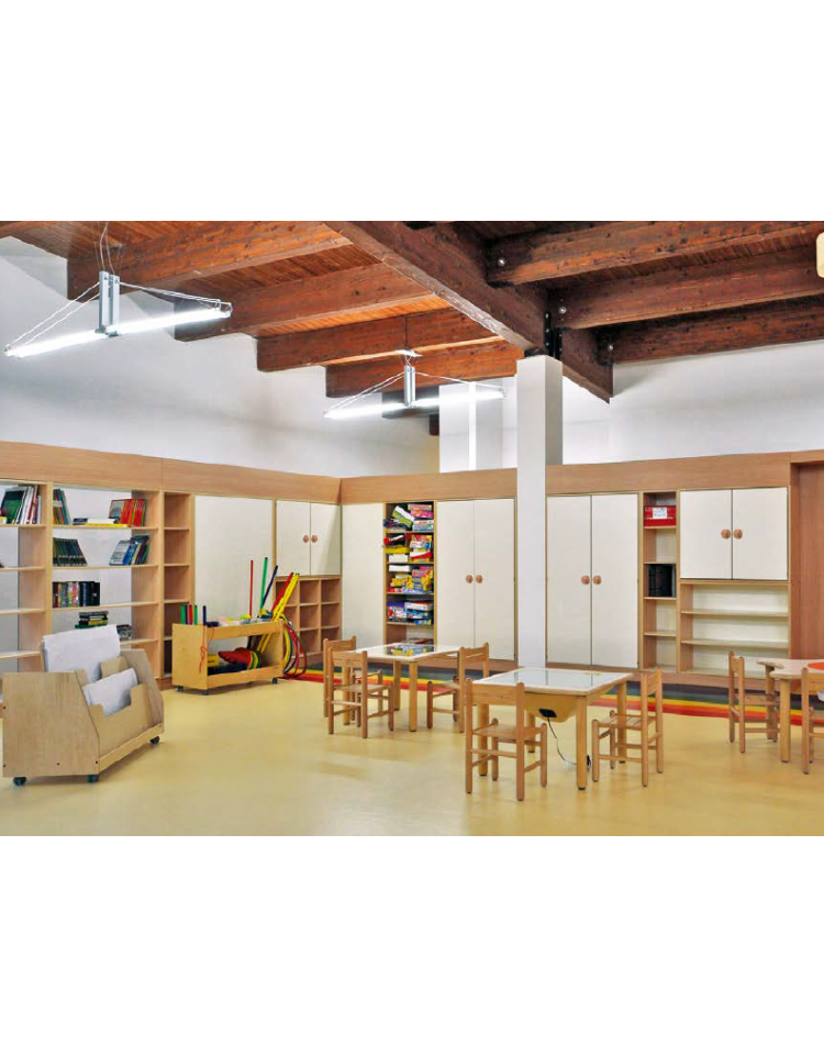 I mobili contenitori compongono un sistema modulare ricco di elementi flessibili e dinamici, in grado di creare angoli e pareti divisorie. La schiena, a vista, è attrezzabile con specchi, pannelli in sughero e lavagne. I mobili sono completamente smontabili e le varie parti che li compongono sono sostituibili separatamente: questa caratteristica prolunga il tempo di utilizzo degli arredi e ne facilita la dismissione a fine ciclo di vita. I bordi, in ABS, sono arrotondati e verniciati al naturale. Le ante sono dotate di feltrini antirumore in battuta e le maniglie sono disponibili sia in legno sia in cuoio antitrauma. Linee pulite e colori chiari per rispondere alle esigenze di una buona pedagogia con un design moderno e minimale. Bordi in rovere sbiancato, ante e ripiani a giorno a filo con la struttura, maniglie essenziali e piedi squadrati rinnovano la linea dei mobili. Tutti possono essere messi su ruote dotate di sistema di bloccaggio. Finitura della struttura e dei piani in laminato color latte antriflesso. Ante a filo per aumentare il pregio estetico e la linearità delle composizioni d’arredo. Nuovo bordo tridimensionale in rilievo, per sottolineare la percezione materica del mobile.