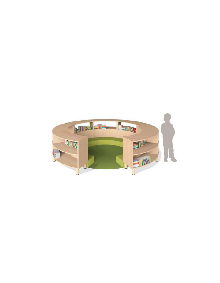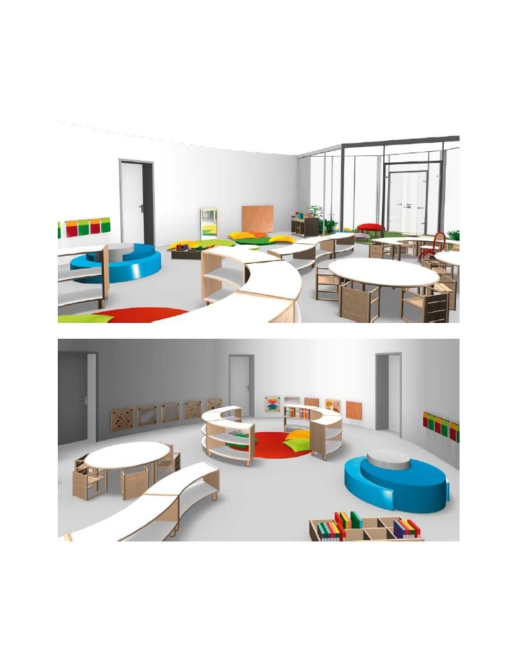 I mobili curvi compongono un sistema modulare ricco di elementi flessibili e dinamici, in grado di creare angoli e pareti divisorie. La schiena, a vista, è attrezzabile con specchi, pannelli in sughero e lavagne. I mobili sono completamente smontabili e le varie parti che li compongono sono sostituibili separatamente: questa caratteristica prolunga il tempo di utilizzo degli arredi e ne facilita la dismissione a fine ciclo di vita. I bordi, in ABS, sono arrotondati e verniciati al naturale. Linee pulite e colori chiari per rispondere alle esigenze di una buona pedagogia con un design moderno e minimale. Bordi in rovere sbiancato, i ripiani a giorno a filo con la struttura. Finitura della struttura e dei piani in laminato color latte antriflesso. Ante a filo per aumentare il pregio estetico e la linearità delle composizioni d’arredo. Nuovo bordo tridimensionale in rilievo, per sottolineare la percezione materica del mobile.