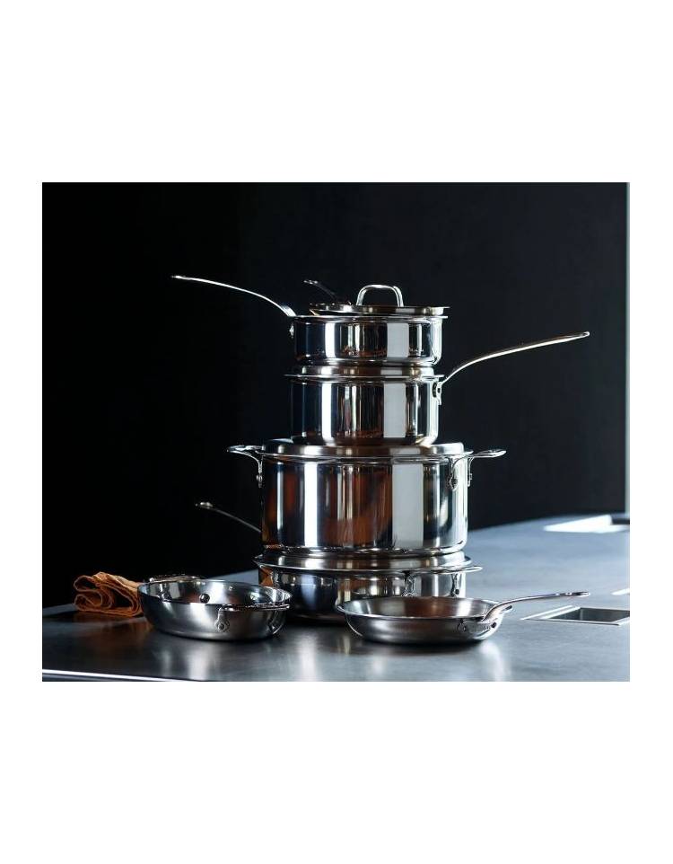 Professionale ed elegante. Manici in acciaio inox finitura lucida, resistenti al calore e progettati per fornire una presa sicura ed ergonomica. Sono fissati saldamente ai corpi con rivetti in acciaio inossidabile. I corpi integralmente in multilaminato garantiscono un riscaldamento rapido e uniforme. Interno in acciaio inossidabile 18/10 satinato, anima in alluminio trilaminato, esterno in acciaio inossidabile per induzione con finitura a specchio. Spessore medio 2,7 mm. Adatta per l’uso su tutti i piani cottura compresa l’induzione.