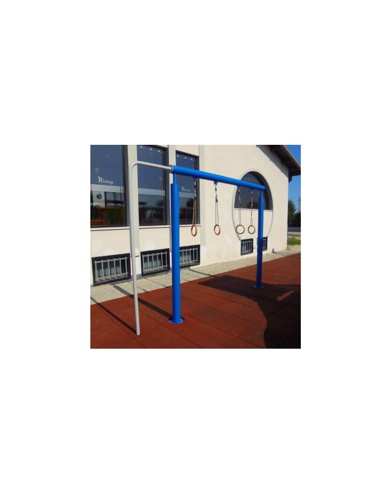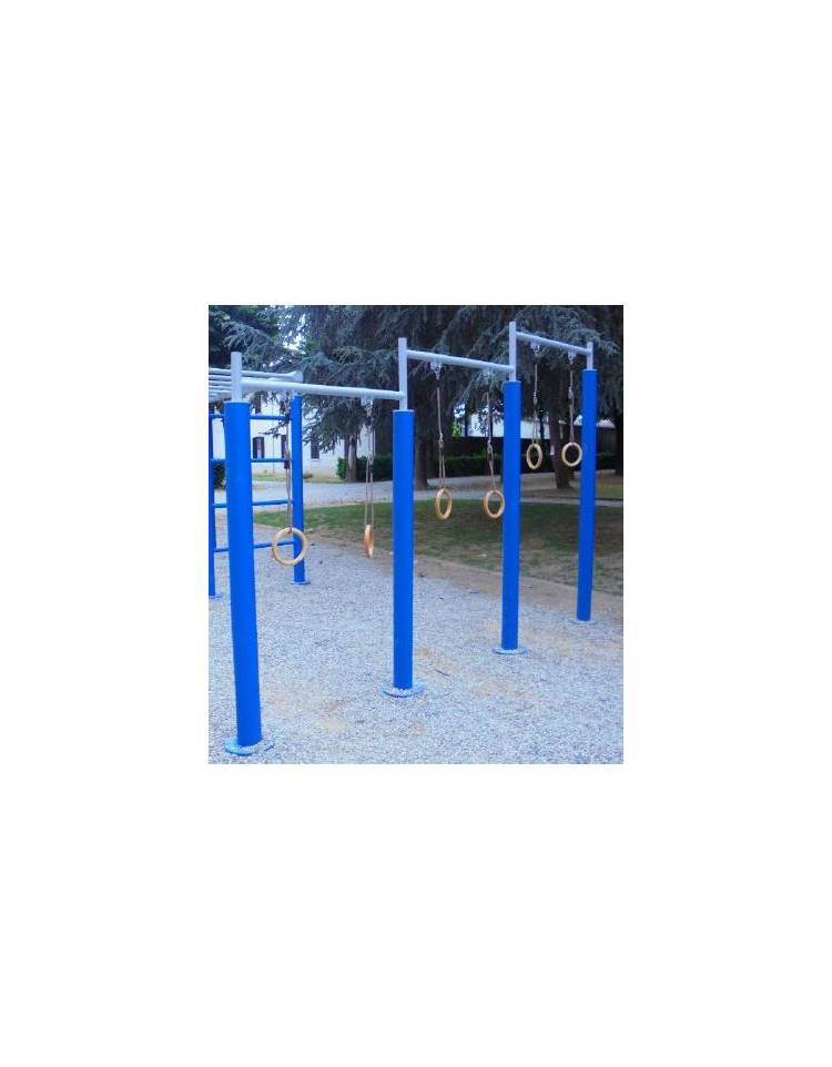 Stazione fitness realizzata con struttura portante in tubolare quadro sez. mm 80x80 in acciaio elettrozincato e verniciato a sostegno di n° 1 panca inclinata realizzata con telaio in tubolari di acciaio zincato e verniciato sez. mm 50x30 e pannello in bilaminato stratificato HPL pantografato privo di spigoli; n° 1 panca step con telaio in tubolari di acciaio zincato e verniciato sez. mm 50x30 e pannello in bilaminato stratificato HPL pantografato privo di spigoli. Assemblaggio mediante bulloneria in acciaio zincato 8.8 e dadi autobloccanti. Elementi copridado a norma in nylon colorato. Tappi copripalo in polietilene. Verniciatura a forno 180°C in polvere poliestere con elevatissima resistenza agli agenti atmosferici e alle radiazioni UV. Attacchi in acciaio zincato, per l’ancoraggio al suolo.