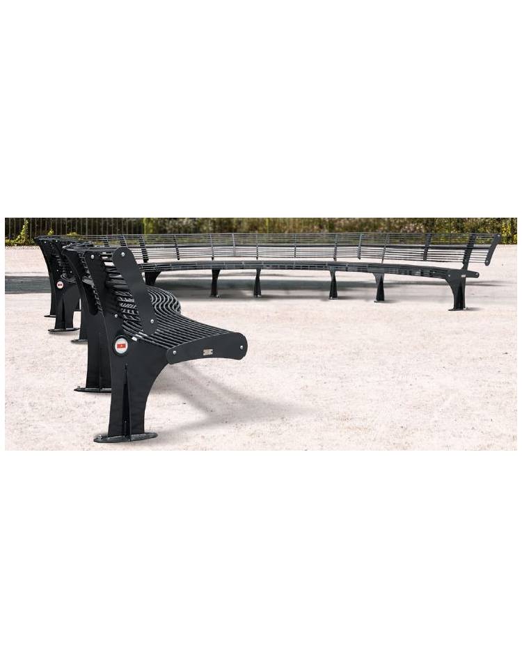 Panchina curva senza schienale in acciaio zincato e verniciato. Seduta composta da trafilati in tubolare saldati a sostegni in lamiera sagomati e chiusi da flange di chiusura tagliate a laser. I supporti possono essere predisposti per il fissaggio al suolo con tasselli o da inghisare.