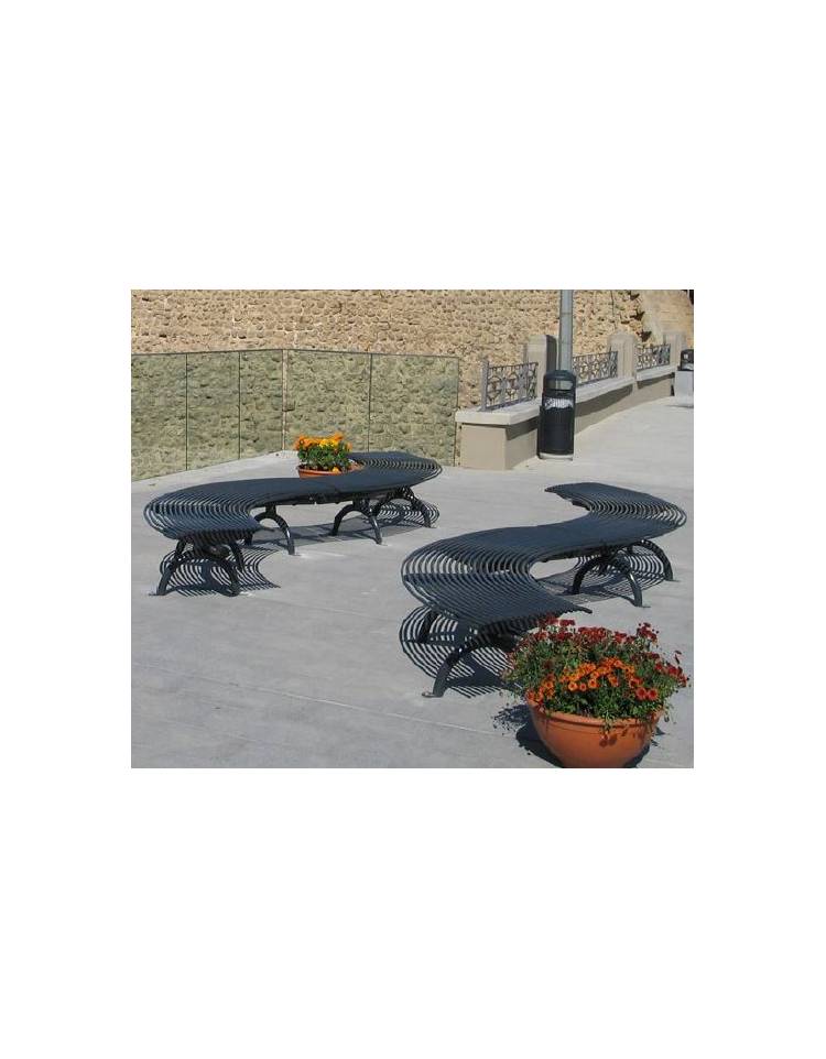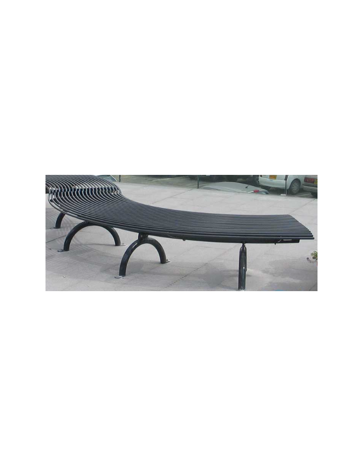 Panchina senza schienale costituita da una struttura in acciaio zincato e verniciato a polveri poliestere termoindurenti. È composta da 4 spalle di supporto sagomate da lamiera d’acciaio collegate tra loro da un robusto traverso orizzontale in tubo calandrato (a formare un angolo di 90°) e da una seduta formata da 22 trafilati in tubo, anch’essi calandrati. Il traverso ed i trafilati sono chiusi alle estremità da tappi in PVC. I tre supporti in tubolare sagomati ad arco sono fissati alla barra orizzontale tramite viti e possono essere forniti con kit di appoggio o fissaggio al suolo. Tutta la viteria è in acciaio inox. Adatta ad ambienti raffinati e di prestigio sia esterno che interno.