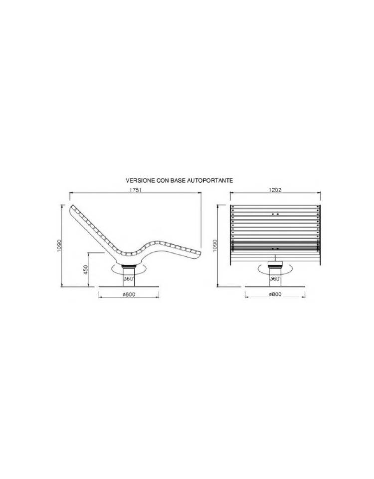 Panchina Chaise longue – rotante 360 °. Panchina/Sdraio dotata di un meccanismo per la rotazione a 360°. Costituita da un telaio principale in acciaio sagomato con tecnologia laser e da una piastra base forata per il fissaggio al suolo; disponibile anche nella versione con piastra base autoportante. La seduta con schienale è formata da doghe in legno di pino nordico sono impregnate in autoclave in conformità alle norme DIN 68800-3 per preservare il legno contro l’attacco di funghi, muffe e agenti atmosferici; a richiesta può essere fornita con legno di pregio. La Panchina/Sdraio può essere realizzata nella versione “singola” con una larghezza di 600 mm o doppia con una larghezza di 1200 mm. Tutte le parti metalliche sono zincate e verniciate a polveri poliestere termoindurenti nelle diverse colorazioni RAL. La viteria è in acciaio inox.