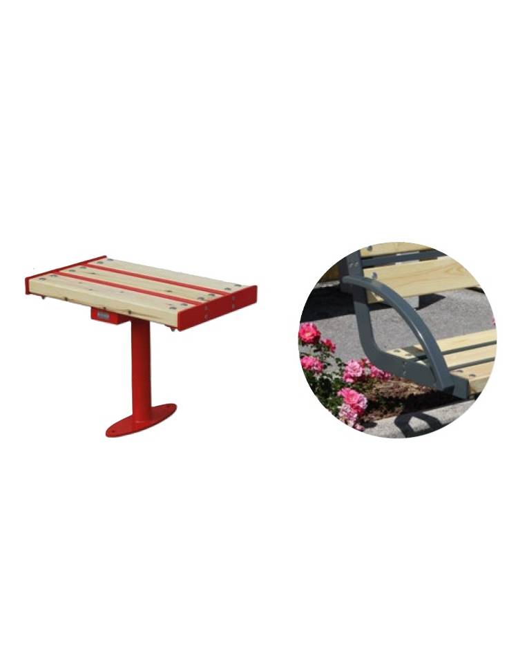 Panchina realizzata con struttura in acciaio zincato e verniciato nelle varie colorazioni RAL. I supporti sono realizzati in lamiera, sopra i quali viene fissata la seduta tramite viti in acciaio inox. La seduta è composta da un telaio in tubo rettangolare calandrato e forato, sul quale vengono fissate le doghe in pino pregio. Panchina dal design lineare e molto robusta.