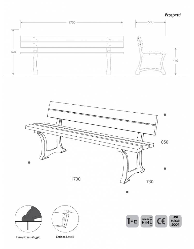 N°5 listoni in legno, sezione mm 1700x120x35h, smussati ai 4 angoli e forati per il fissaggio ai sostegni con viteria in acciaio.