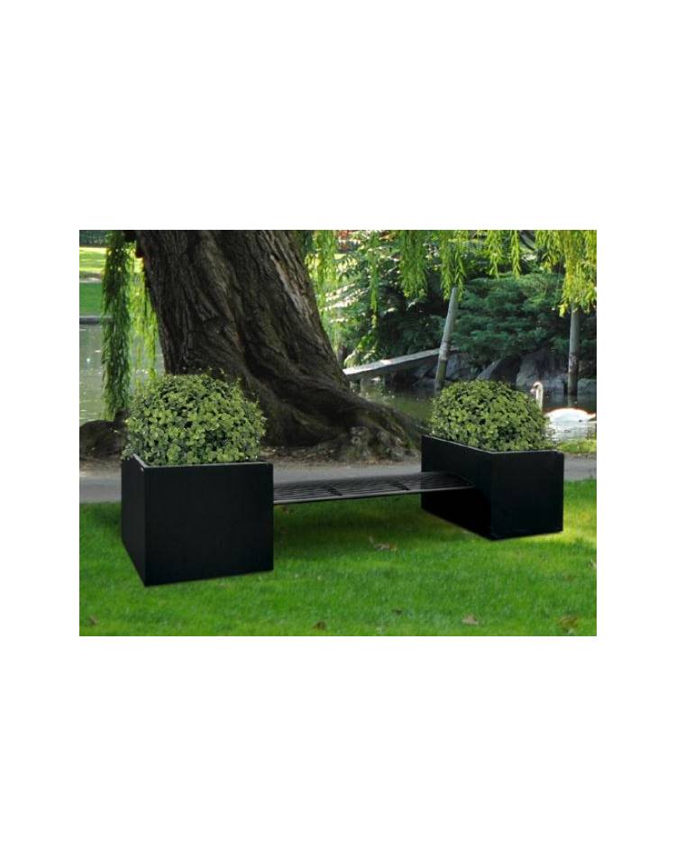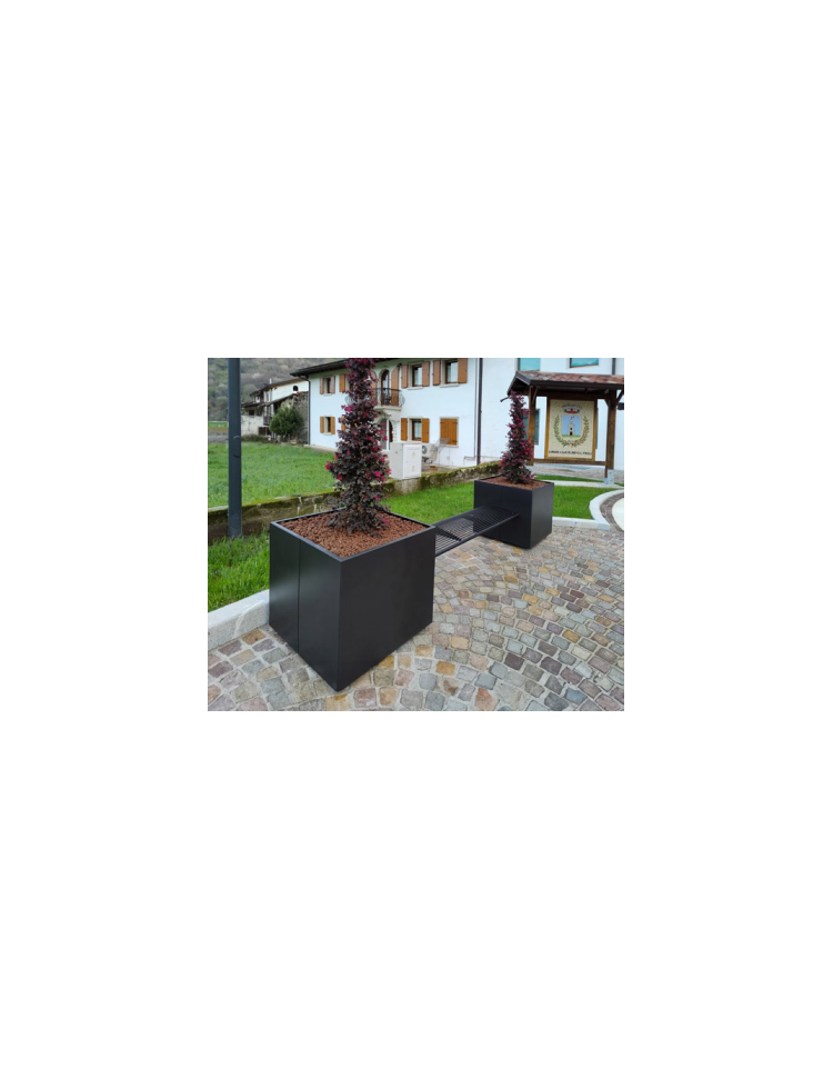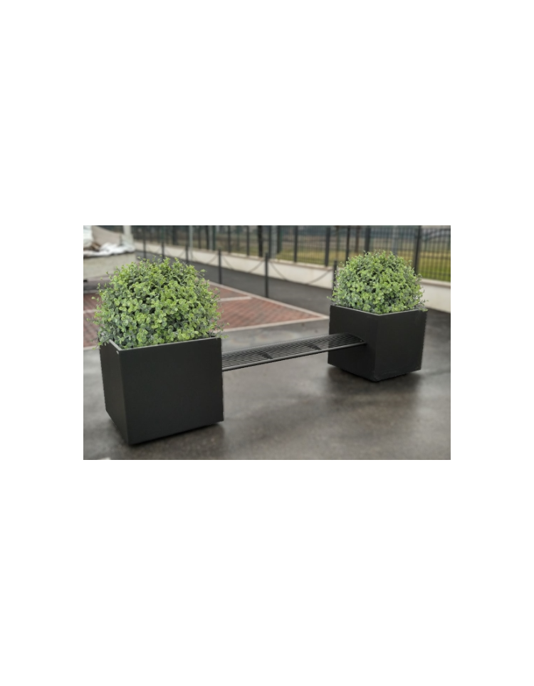 Panchina con fioriere laterali – seduta acciaio. Seduta in acciaio formata da trafilati di acciaio e 2 tubolari, saldati a due supporti laterali e 2 supporti centrali sagomati. La seduta è fissata alle fioriere tramite viti. Fioriera laterale dim. 70x70x70 cm realizzata da uno scatolato in lamiera tagliata al laser e piegata. La parte superiore è ricavata dalla piega della lamiera e crea una cornice. Il fondo in lamiera è fissato alle pareti tramite saldatura, inoltre ha saldato nella parte inferiore un quadro formato da piatto per rialzare il tutto Tutte le parti metalliche sono zincate e verniciate a polveri poliestere termoindurenti secondo le diverse colorazioni RAL. La viteria è in acciaio inox. Adatta ad essere posizionata all’esterno in condomini, scuole, centri commerciali, … Grazie al suo peso non necessita di essere fissata al suolo