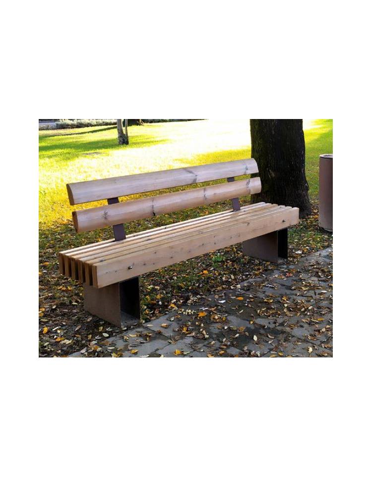 Panchina realizzata con struttura in acciaio zincato e verniciato. I supporti sono realizzati in lamiera, sopra i quali viene fissata una piastra sagomata e forata per il distanziamento e fissaggio delle doghe in legno. La seduta è formata da 6 doghe in pino nordico, impregnate in autoclave in conformità alle norme DIN 68800-3 per preservare il legno contro l’attacco di funghi, muffe e agenti atmosferici. E’ fornita di schienale con doghe sagomate appositamente per un buon appoggio della schiena, fissate direttamente alla seduta tramite due supporti in acciaio tagliati con tecnologia laser. La viteria è tutta in acciaio inox.