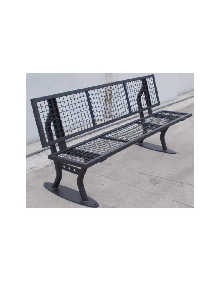 Panchina con braccioli composta da una struttura in acciaio zincato a caldo e successivamente verniciato a poveri epossidiche formata da due gambe sagomate in tubolare diam. 48 che poggiano su una base di forma ellittica 600x150 sp. 8 mm tassellabile al suolo e sulla parte superiore da un piatto sul quale viene fissata la seduta. Il piano della seduta è composta da rete elettrosaldata filo 4 maglia 40x40 mm opportunamente bordata tramite angolare 30x3 mm. Su richiesta possono essere concordate differenti colorazioni RAL della struttura e tipologia delle doghe in legno.