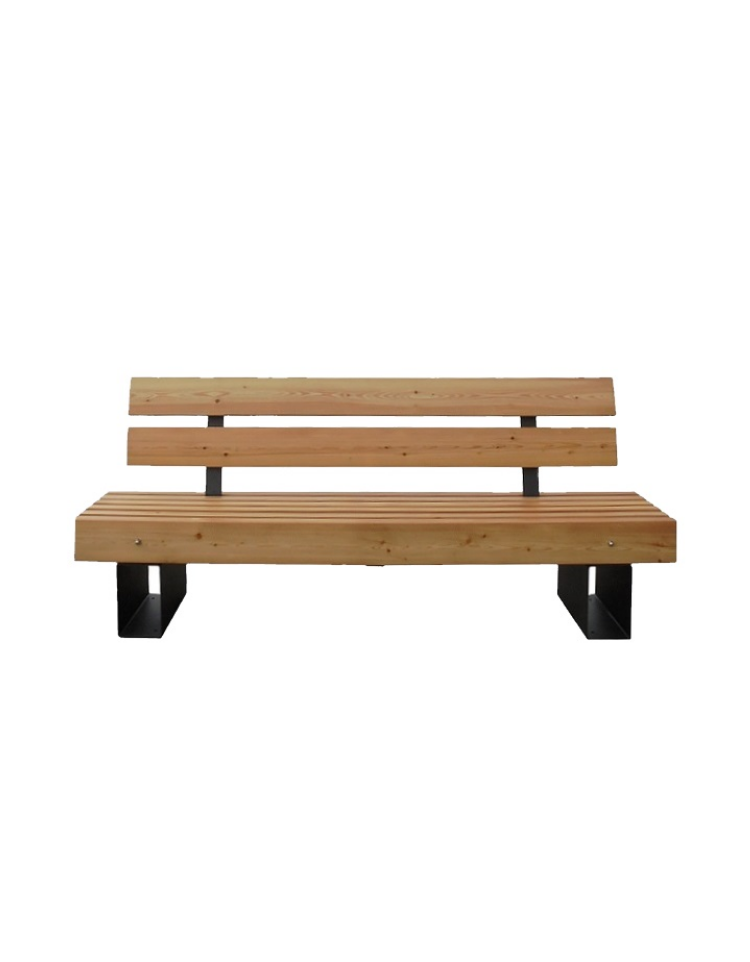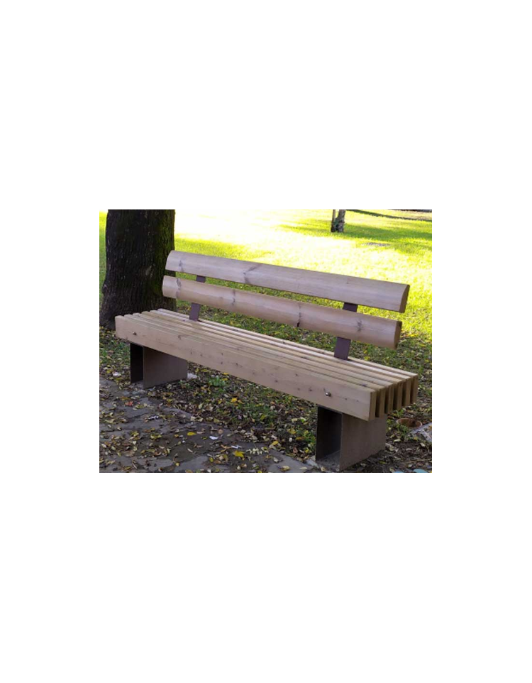 Panchina dal design lineare e molto robusta realizzata con struttura in acciaio zincato e verniciato. I supporti sono realizzati in lamiera, sopra i quali viene fissata una piastra sagomata e forata per il distanziamento e fissaggio delle doghe in legno. La seduta è formata da doghe in legno di pregio trattato per l'esterno. E’ fornita di schienale con doghe sagomate appositamente per un buon appoggio della schiena, fissate direttamente alla seduta tramite due supporti in acciaio tagliati con tecnologia laser. La viteria è tutta in acciaio inox.
