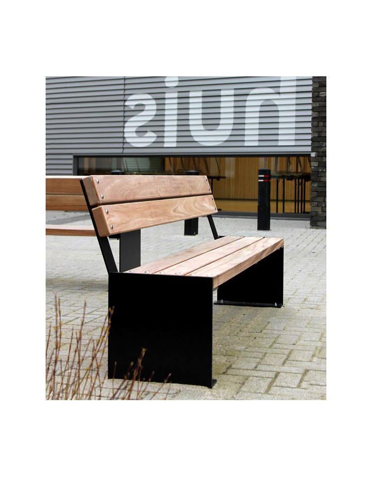Panchina con struttura portante in acciaio zincato e verniciato costituita da due robuste spalle laterali in lamiera di acciaio sulle quali sono saldate le piastre base per poter fissare la panchina al suolo con tasselli ad espansione. Nella parte superiore dei supporti sono saldate le piastre dove andranno fissate le doghe in legno. La seduta e lo schienale sono formati da doghe in legno di pregio di grosso spessore. Per dare stabilità alla seduta ed allo schienale centralmente viene fissato rispettivamente un rinforzo tramite viti. Tutta la viteria è in acciaio inox.