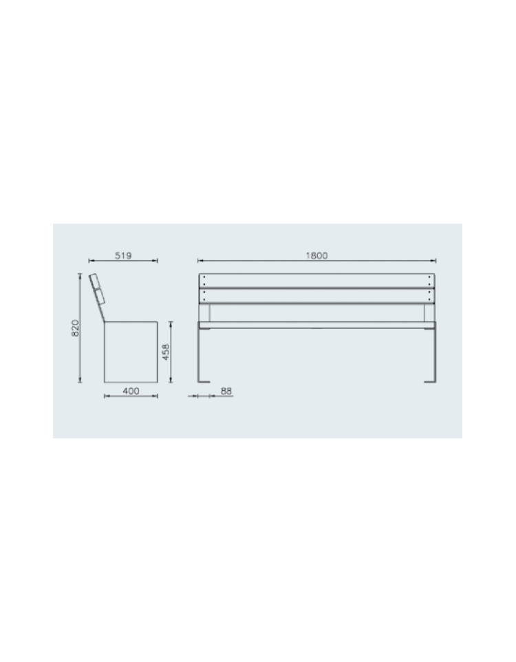 Panchina con struttura portante in acciaio zincato e verniciato costituita da due robuste spalle laterali in lamiera di acciaio sulle quali sono saldate le piastre base per poter fissare la panchina al suolo con tasselli ad espansione. Nella parte superiore dei supporti sono saldate le piastre dove andranno fissate le doghe in legno. La seduta e lo schienale sono formati da doghe in pino nordico di grosso spessore. Per dare stabilità alla seduta ed allo schienale centralmente viene fissato rispettivamente un rinforzo tramite viti. Tutta la viteria è in acciaio inox.