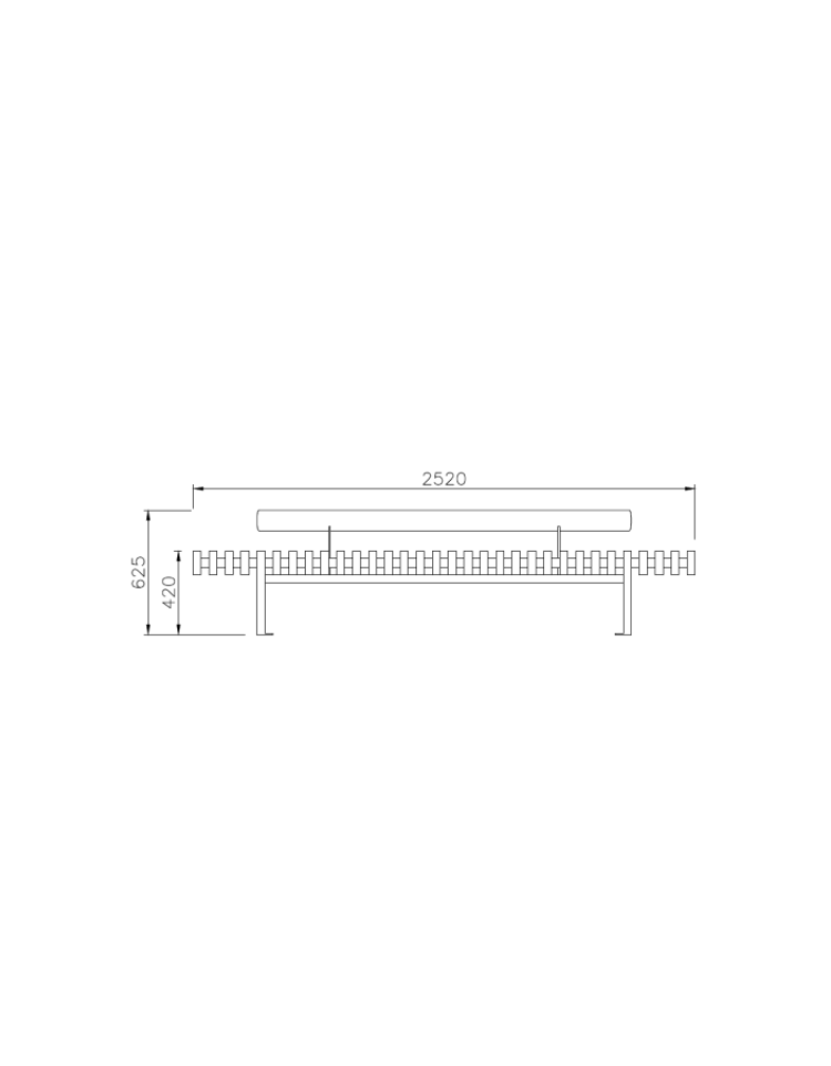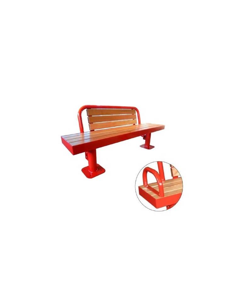Panchina con struttura portante realizzata in tubolare rettangolare sul quale è saldata una piastra base per il fissaggio al suolo con tasselli. Sul fianco sono presenti due fori per l’inserimento del tubolare di sostegno dove andranno fissate le doghe. La seduta è realizzata da doghe in legno di pregio fissate tramite viti sul tubolare. Lo schienale è costituito da un tubolare chiuso con due fondelli e fissato tramite viti alle doghe. Tutte le parti metalliche sono zincate e verniciate. La viteria è in acciaio inox.