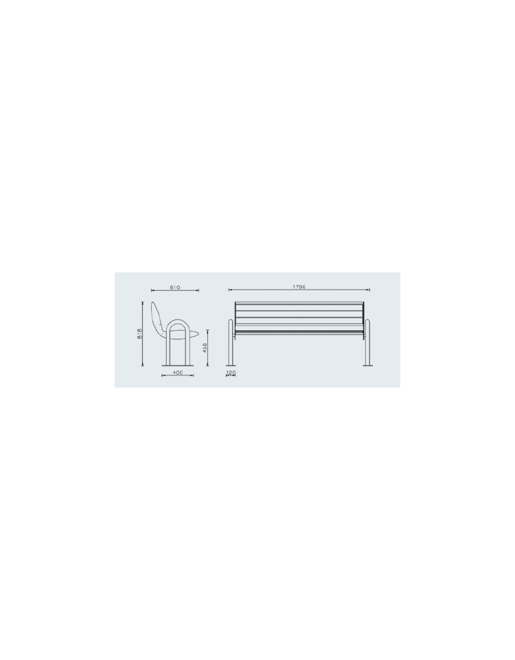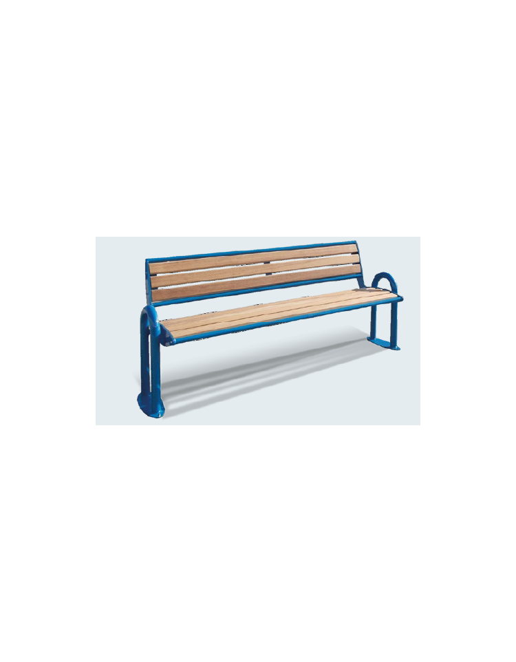 Panchina metallo-legno costituita da due spalle laterali formate da una flangia in acciaio sagomata con tecnologia laser, saldata tramite due spezzoni di tubolare su un arco in tubolare alla estremità inferiore del quale è saldata una base di forma ellittica predisposta per poter fissare la panchina al suolo con tasselli ad espansione. Seduta formata da due tubolari in acciaio e 4 doghe di legno in pino nordico impregnate in autoclave in conformità alle norme DIN 68800-3 per preservare il legno contro l’attacco di funghi, muffe e agenti atmosferici, fissate su tre supporti in piatto, uno centrale e due laterali saldati ai supporti laterali sagomati . Lo schienale ha le stesse caratteristiche della seduta con 3 doghe di legno. La seduta e lo schienale sono fissati alle spalle tramite viti. Le parti metalliche sono zincate e verniciate a polveri poliestere termoindurenti nelle diverse colorazioni RAL. La viteria in acciaio inox. Molto robusta, particolarmente adatta a luoghi di grande affluenza, vie pedonali, grandi parchi.