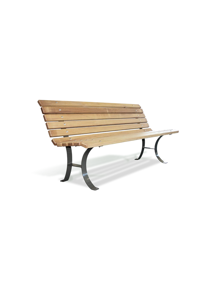 Panchina con struttura portante in piatto di acciaio zincato e verniciato nelle varie colorazioni RAL, sagomato e curvato, estremità presso piegate e forate per il fissaggio al terreno. Seduta e schienale composti da 10 doghe in legno di pino nordico impregnato a pressione in autoclave in conformità alle norme DIN 68800, fissate alla struttura tramite viti interamente in acciaio inox. Panchina dal design semplice ma confortevole, adatta a parchi o aree residenziali (case di riposo, condomini, …).