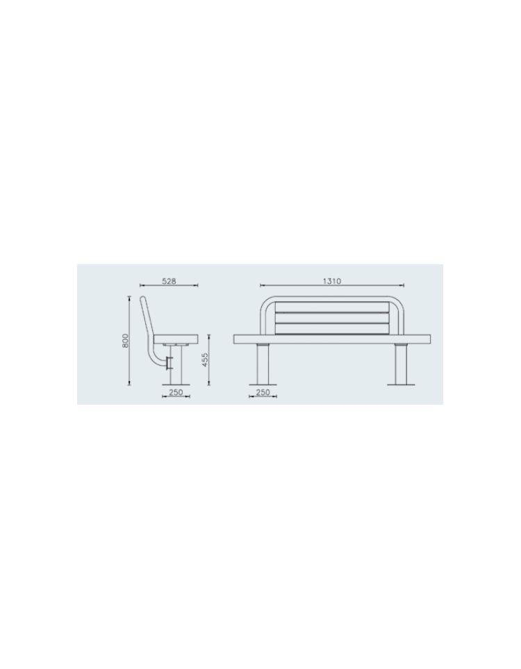 Panchina con struttura in acciaio zincato e verniciato. La struttura della seduta è realizzata da supporti in tubolare con piastra di base forata per il fissaggio al suolo con tasselli. La struttura dello schienale è in tubolare dove vengono fissate le doghe in legno. La seduta e lo schienale sono in doghe in legno di pino trattato per l’uso esterno. La viteria è in acciaio inox.