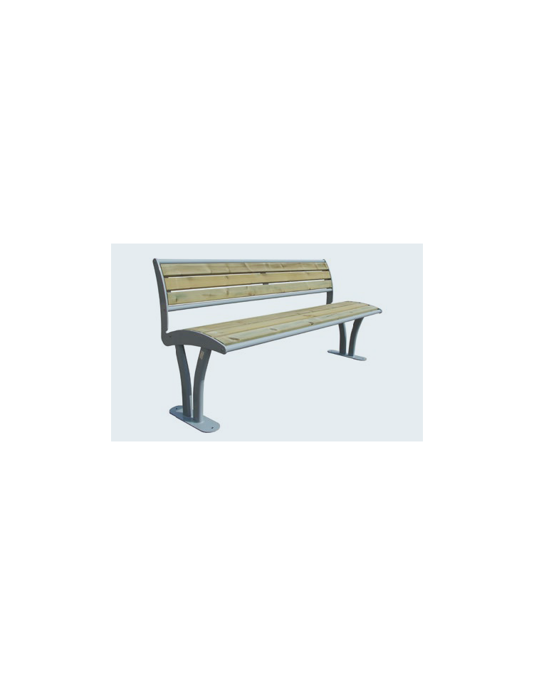 Panchina con schienale costituita da due spalle laterali formate da flange in acciaio sagomate con tecnologia laser, alle quali vengono saldati due tubolari in acciaio a sezione ovale, opportunamente sagomati, con funzione di sostegno e una piastra base di forma ovale predisposta per poter fissare la panchina al suolo con tasselli ad espansione. Seduta formata da due tubolari in acciaio e 5 doghe di legno di pregio, trattate per l'esterno, fissate su tre supporti in piatto, uno centrale e due laterali saldati ai supporti laterali sagomati. Lo schienale ha le stesse caratteristiche della seduta con 3 doghe di legno. Seduta e schienale sono fissati alle spalle tramite viti. Le parti metalliche sono zincate e verniciate a polveri poliestere termoindurenti nelle diverse colorazioni RAL. La viteria è in acciaio inox.