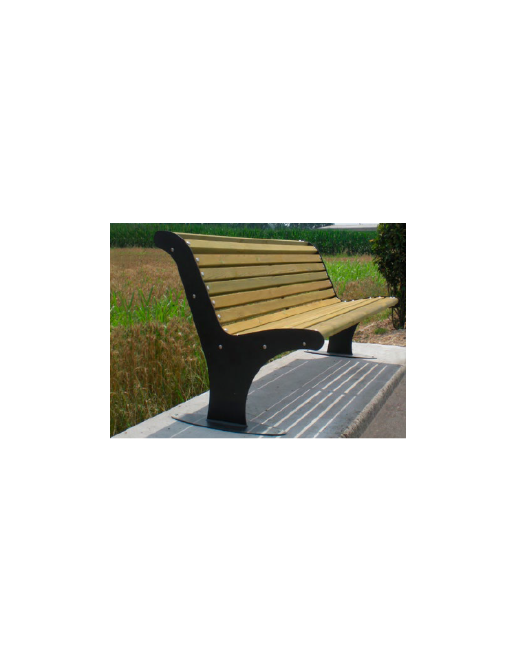 Panchina costituita da due robuste spalle laterali in acciaio tagliate con tecnologia laser saldate su basi di forma ellittica predisposte per poter fissare la panchina al suolo con tasselli ad espansione. Seduta con schienale formata da 15 doghe in legno di pregio trattate per l'esterno, fissate su tre supporti in piatto, uno centrale e due laterali saldati ai supporti laterali sagomati. La seduta è fissata alle spalle tramite viti. Le parti metalliche sono zincate e verniciate a polveri poliestere termoindurenti nelle diverse colorazioni RAL. La viteria è in acciaio inox.