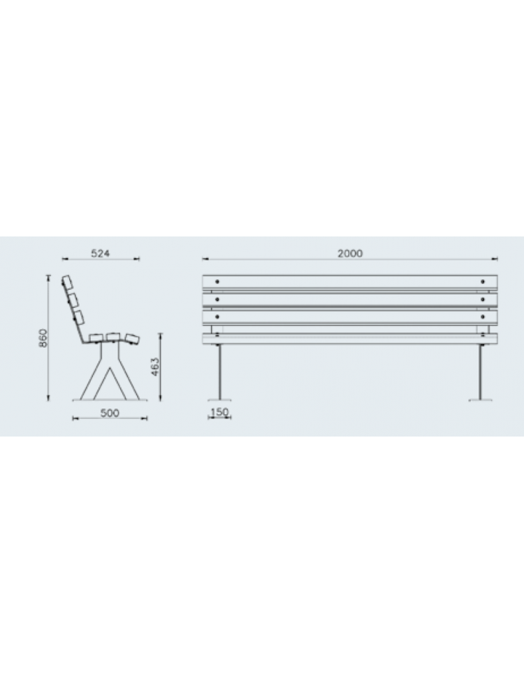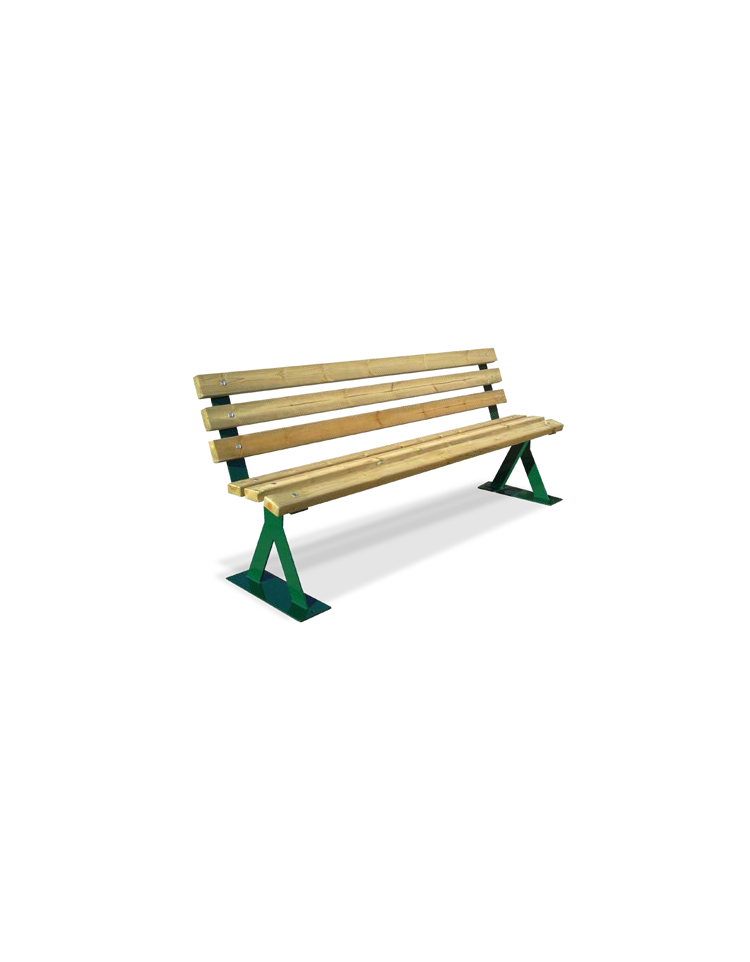 Panchina con braccioli composta da una struttura in acciaio zincato e successivamente verniciata a polveri poliestere termoindurenti formata da due fianchi in piatto di acciaio che poggiano su una base di forma rettangolare tassellabile al suolo e sulla parte superiore da un piatto sul quale vengono fissate con bulloneria in acciaio le doghe di legno di pino impregnato in autoclave.