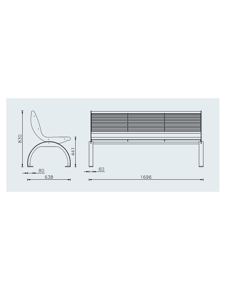Panchina con schienale realizzata completamente in acciaio inox. La seduta e lo schienale sono formati da tondi e tubolari, mentre i fianchi sono composti da componenti in lamiera tagliata con tecnologia laser, sagomati e saldati. Alla base sono presenti delle piastre forate per il fissaggio della panchina al suolo tramite tasselli.