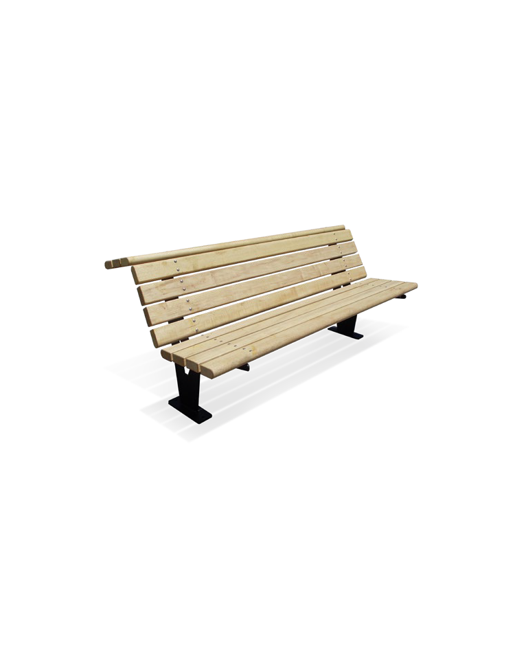 Panchina costituita da due robuste spalle laterali in acciaio tagliate con tecnologia laser saldate su basi di forma rettangolare predisposte per poter fissare la panchina al suolo con tasselli ad espansione. I due fianchi sono collegati tra di loro da due tiranti in tubolare per rendere più stabile la seduta. Seduta con schienale formata da doghe in legno di pregio, trattate per l'esterno, fissate su tre supporti in piatto, uno centrale e due laterali saldati ai supporti laterali. Le doghe sono fissate alla struttura tramite viti. Le parti metalliche sono zincate e verniciate a polveri poliestere termoindurenti. La viteria è in acciaio inox.