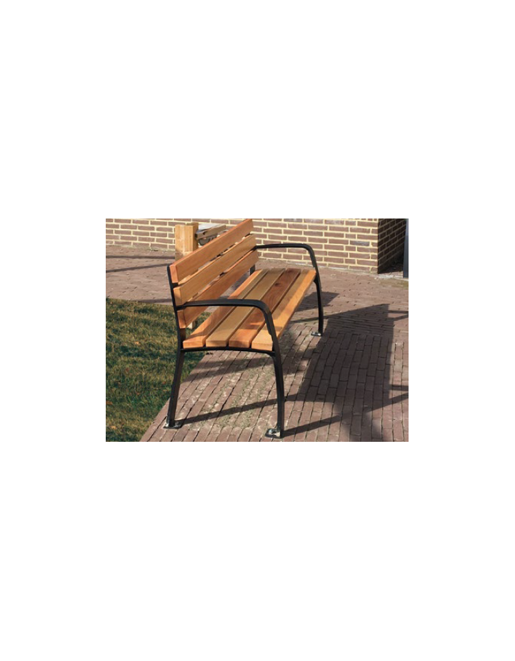 Panchina senza schienale con struttura in acciaio zincato e successivamente verniciato a polveri epossidiche nelle varie colorazioni RAL. La panchina è composta da 2 supporti in piatto rinforzati da un profilo tagliato a laser. Alla base sono fissate delle piastrine per il fissaggio al suolo tramite tasselli. Le doghe di legno della seduta e dello schienale sono in pino nordico impregnato in autoclave per preservare il legno contro l’attacco di funghi, muffe e agenti atmosferici. Tutta la viteria è in acciaio inox.