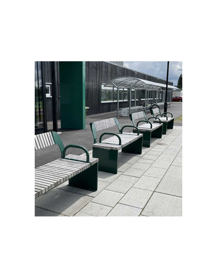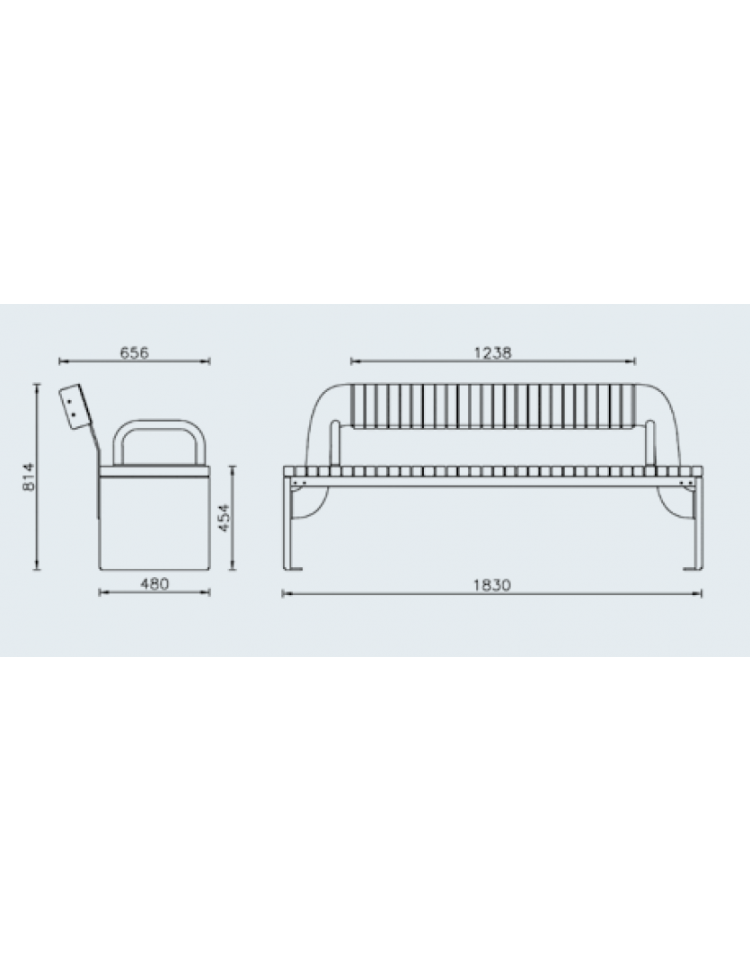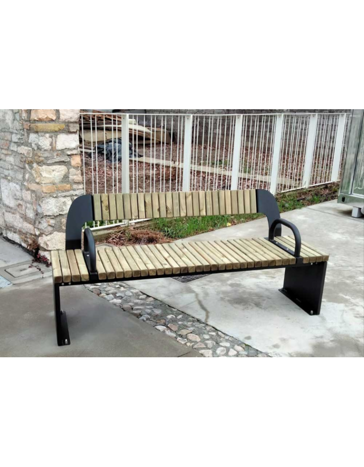Panchina L. 1830 mm con struttura in acciaio zincato e verniciato, costituita da due supporti in lamiera con piastre base per il fissaggio con tasselli. La seduta è formata da doghe in legno di pino nordico trattato per esterno.