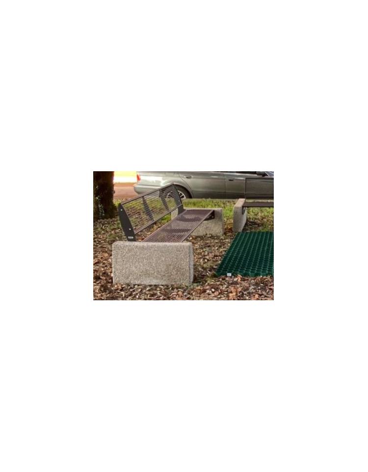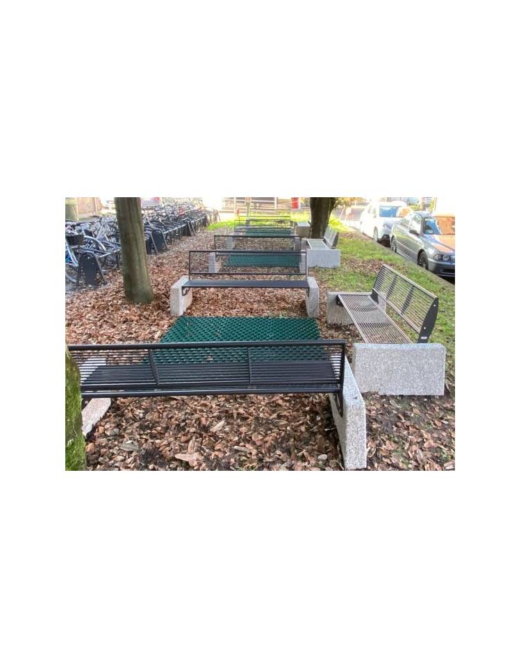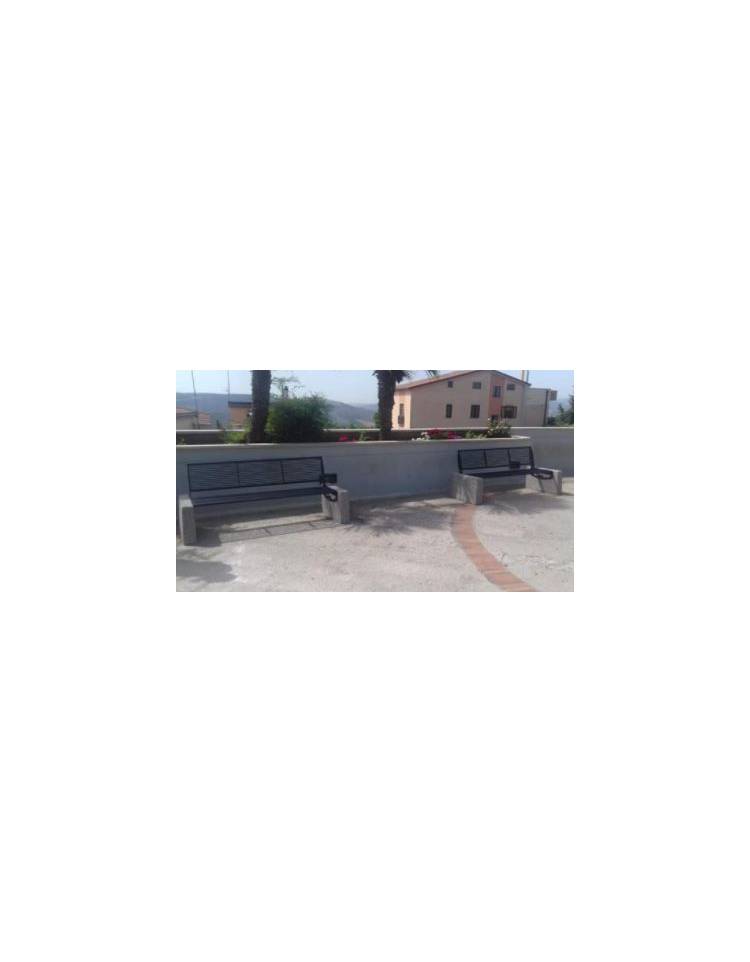 Panchina con schienale. Panchina realizzata con seduta e schienale in acciaio zincato e verniciato a polveri poliestere termoindurenti. Fianchi in cemento bocciardato. E’ costituita da due spalle laterali in acciaio sagomate con taglio laser e fissate tramite viti ai fianchi laterali in conglomerato cementizio, provviste di bussole filettate annegate. Seduta formata da 16 trafilati di acciaio e 2 tubolari, saldati a due supporti laterali e 2 supporti centrali sagomati, irrobustiti da un tirante centrale. Schienale formato da 13 trafilati di acciaio e 2 tubolari, saldati a due supporti laterali e 2 supporti centrali sagomati. Seduta e schienale sono fissati alle spalle tramite viti. Tutta la viteria è in acciaio inox.