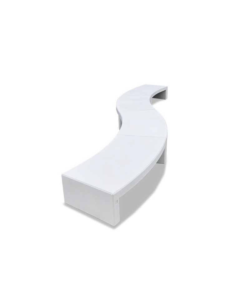 Panchina curva senza schienale, realizzata in graniglia di marmo con finitura acrilica trasparente. Panchina dal design elegante e moderno. Colore disponibile: bianco.