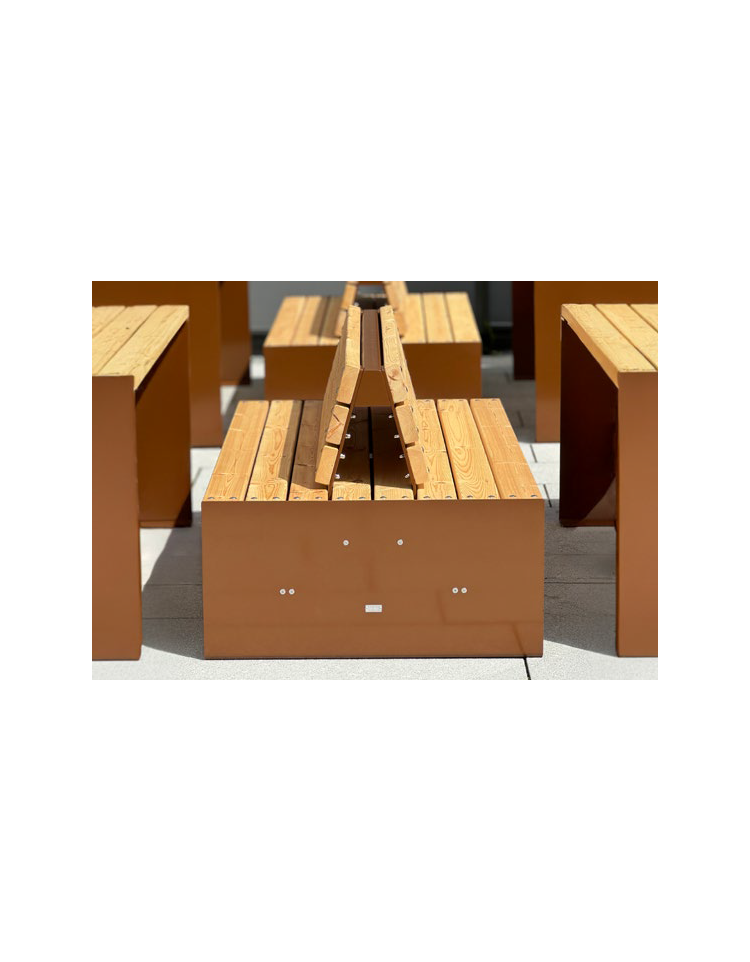 Panchina doppia con struttura portante in acciaio zincato e verniciato costituita da robuste spalle laterali in lamiera di acciaio sulle quali sono saldate le piastre base per poter fissare la panchina al suolo con tasselli ad espansione. Nella parte superiore dei supporti sono saldate le piastre dove andranno fissate le doghe in legno. La seduta e lo schienale sono formati da doghe in legno di pino nordico impregnato in autoclave di grosso spessore. Per dare stabilità alla seduta ed allo schienale centralmente viene fissato rispettivamente un rinforzo tramite viti. Tutta la viteria è in acciaio inox.