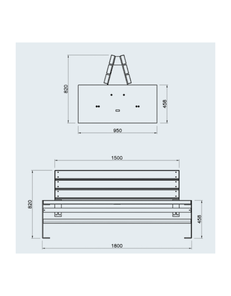 Panchina doppia con struttura portante in acciaio zincato e verniciato costituita da robuste spalle laterali in lamiera di acciaio sulle quali sono saldate le piastre base per poter fissare la panchina al suolo con tasselli ad espansione. Nella parte superiore dei supporti sono saldate le piastre dove andranno fissate le doghe in legno. La seduta e lo schienale sono formati da doghe in legno di pregio di grosso spessore. Per dare stabilità alla seduta ed allo schienale centralmente viene fissato rispettivamente un rinforzo tramite viti. Tutta la viteria è in acciaio inox.