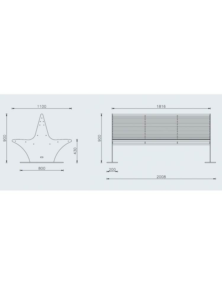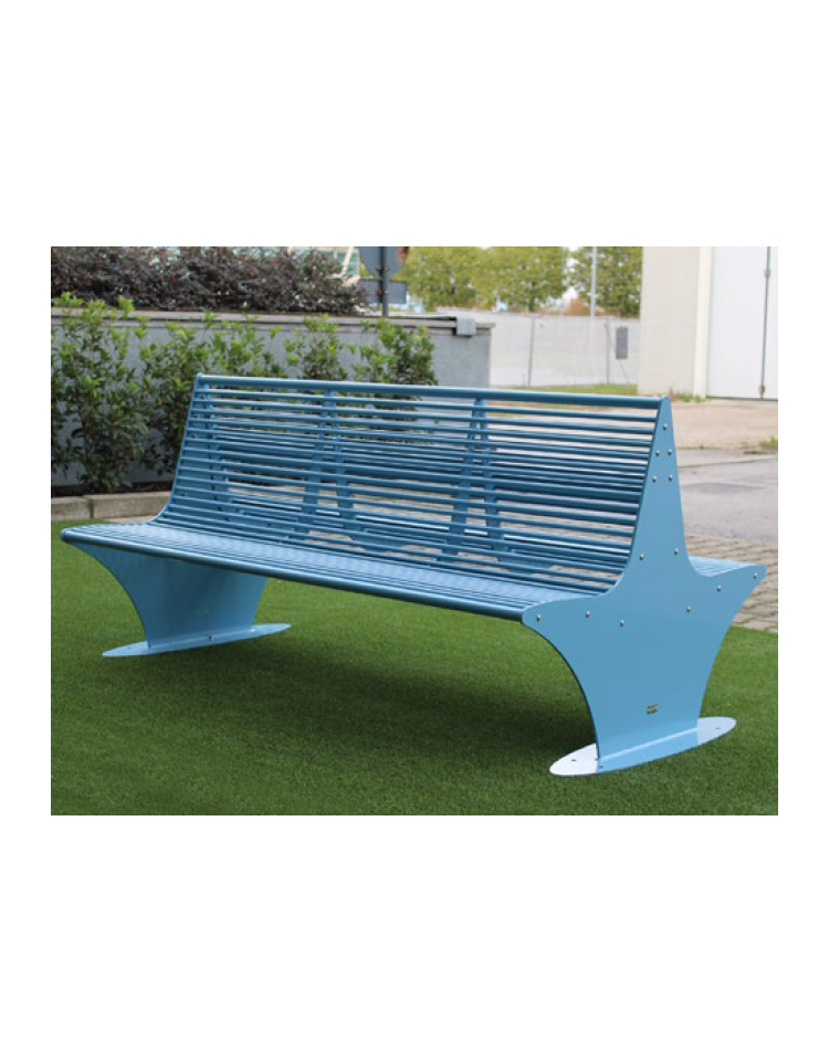 Panchina metallica doppia costituita da due robuste spalle laterali tagliate con tecnologia laser saldate su basi di forma ellittica predisposte per poter fissare la panchina al suolo con tasselli ad espansione. Seduta e schienale realizzati da 31 tubolari di acciaio e 2 tubolari più grandi, saldati a due supporti laterali e 2 supporti centrali sagomati. La seduta è fissata alle spalle tramite viti. Le parti metalliche sono zincate e verniciate a polveri poliestere termoindurenti nelle diverse colorazioni RAL. La viteria è in acciaio inox.
