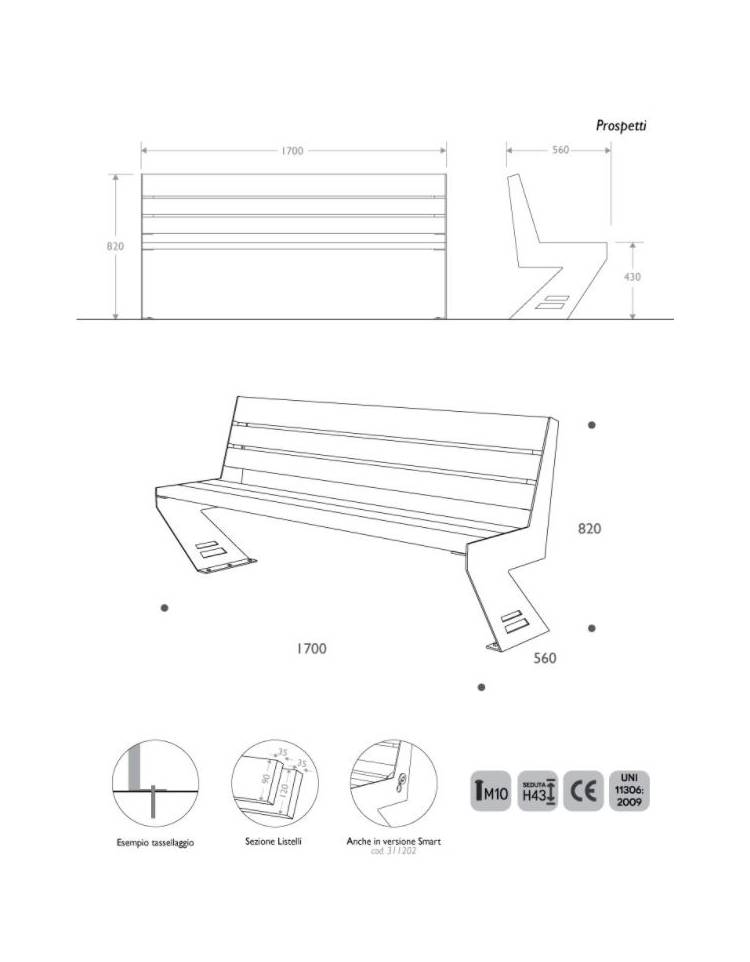 • seduta e schienale realizzati con listoni in legno di pino sezione 90 x 35 mm lunghezza 1700 mm ;