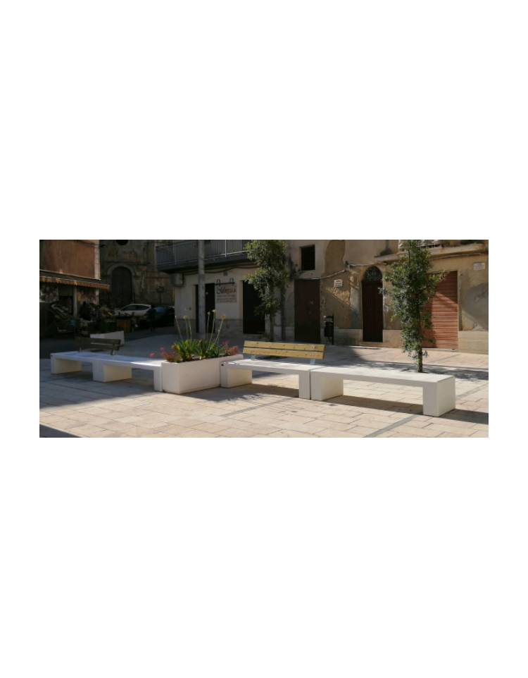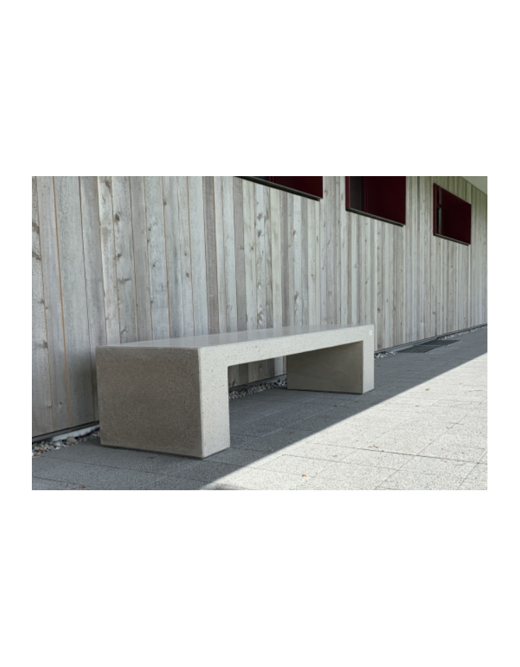 Panchina piana L.2200 mm monoblocco realizzata in graniglia di marmo con acciaio zigrinato; l'impasto è composto da cemento, graniglia di marmo a granulometria studiata, fibre sintetiche, additivi superfluidificanti per ridurre il rapporto acqua/cemento e gettato in casseforme vibrate ad alta frequenza. Il prodotto è fornito con trattamento antigraffiti.
