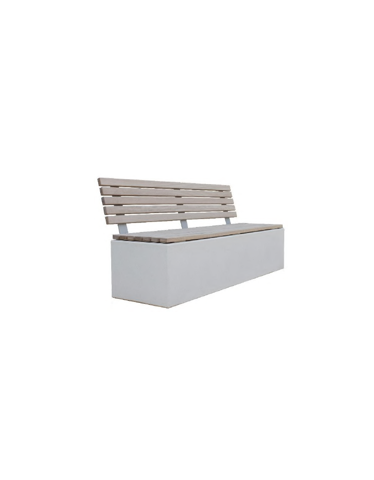 Panchina L.2000 mm monoblocco realizzata in graniglia di marmo con acciaio zigrinato e zincato; l'impasto è composto da cemento, graniglia di marmo a granulometria studiata, fibre sintetiche, additivi superfluidificanti per ridurre il rapporto acqua/cemento e gettato in casseforme vibrate ad alta frequenza. Seduta e schienale realizzati con doghe in legno di pregio.