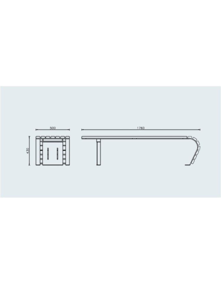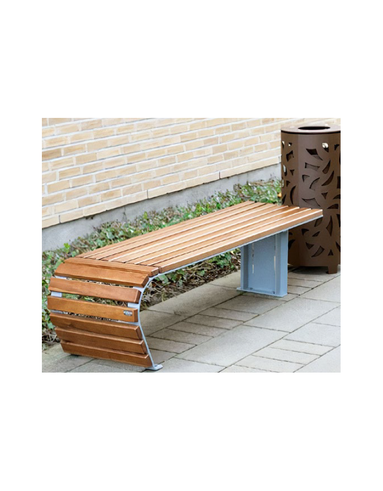 Panchina piana, struttura in acciaio zincato e verniciato. Struttura composta da due piatti di acciaio calandrato, fissati da un lato su una piastra rinforzata da due piatti, sulla quale è fissata una piastra base con fori per il tassellamento a terra. Seduta realizzata da doghe in legno di pregio. La viteria è in acciaio inox. Elegante e di design moderno, si può inserire sia in contesti esterni di pregio che spazi di grande afflusso (centri commerciali, ospedali).