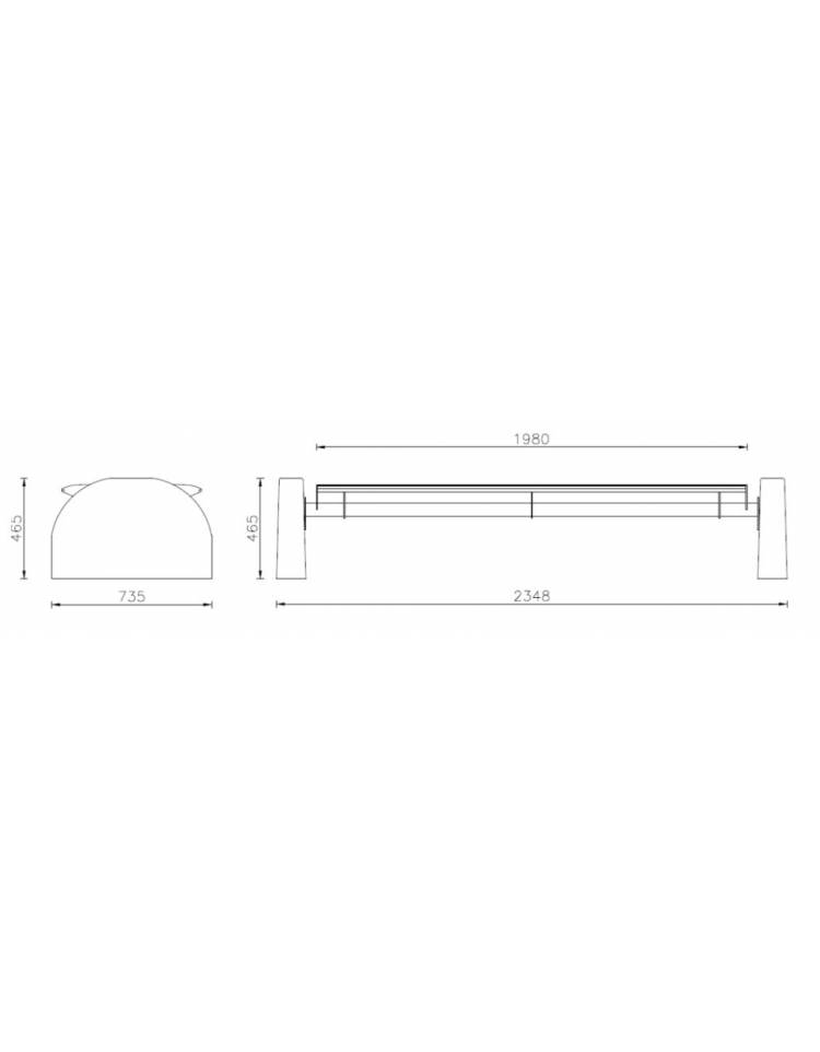 Panchina senza schienale con seduta realizzata interamente in acciaio zincato e verniciato a polveri poliestere termoindurenti nelle diverse colorazioni RAL. I fianchi di forma arrotondata sono in graniglia di marmo. La seduta è composta da trafilati in tubolare, saldati a tre sostegni in lamiera sagomati con tecnologia laser e a loro volta saldati a un traverso orizzontale centrale in tubolare. Alle estremità laterali della seduta-schienale sono fissate due flange di chiusura tagliate con tecnologia laser. Alle due estremità della seduta sono fissate due flange in acciaio, opportunamente forate, con la funzione di ancorare tramite viti la panchina ai muretti laterali, provvisti di bussole filettate annegate. Elegante può essere inserita in tutti i contesti di arredo di pregio.