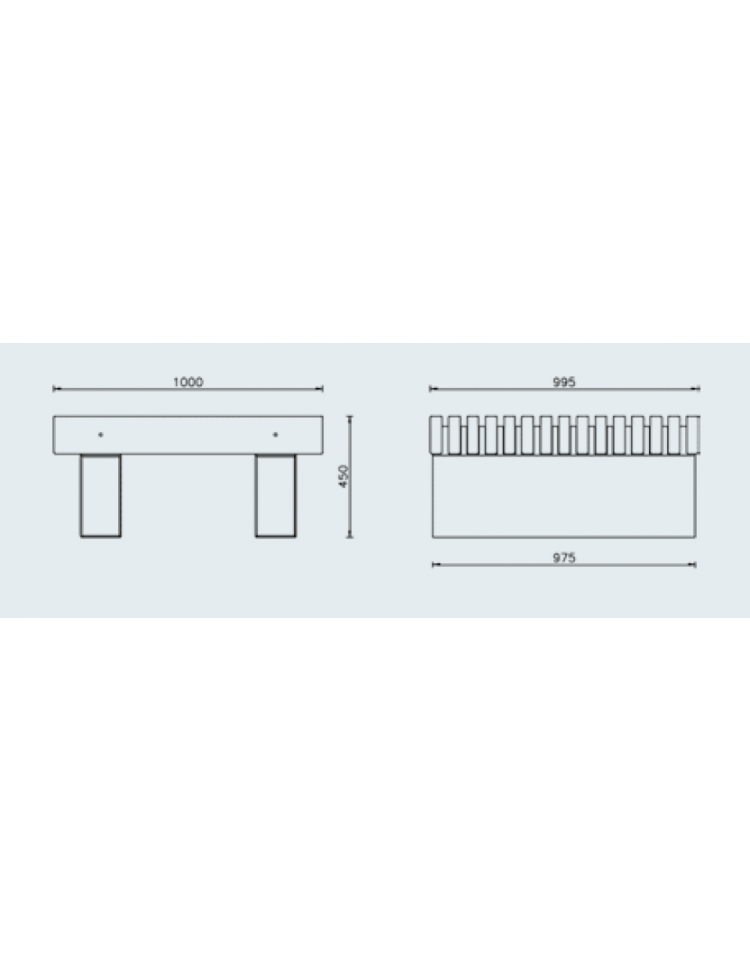 Panchina senza schienale dal design lineare e molto robusta. Realizzata con struttura in acciaio zincato e verniciato. I supporti sono realizzati in lamiera, sopra i quali viene fissata una piastra sagomata e forata per il distanziamento e fissaggio delle doghe in legno. La seduta è formata da doghe in legno di pino. La viteria è tutta in acciaio inox.