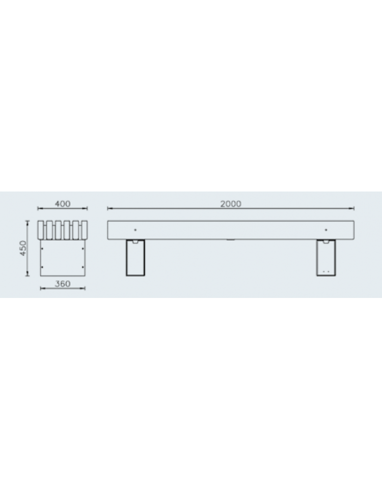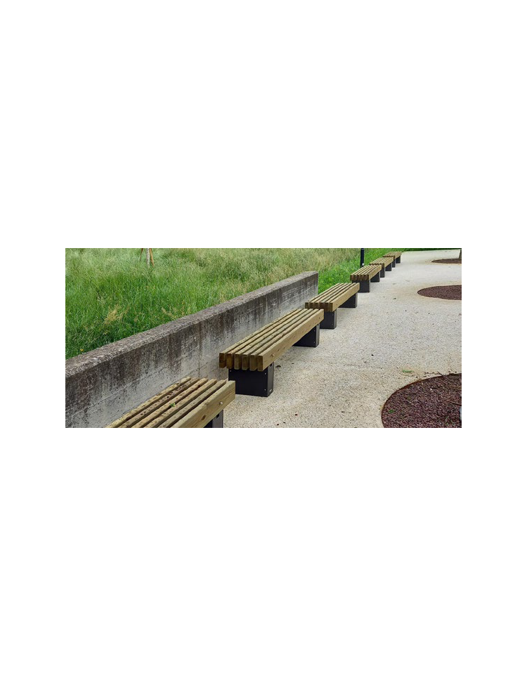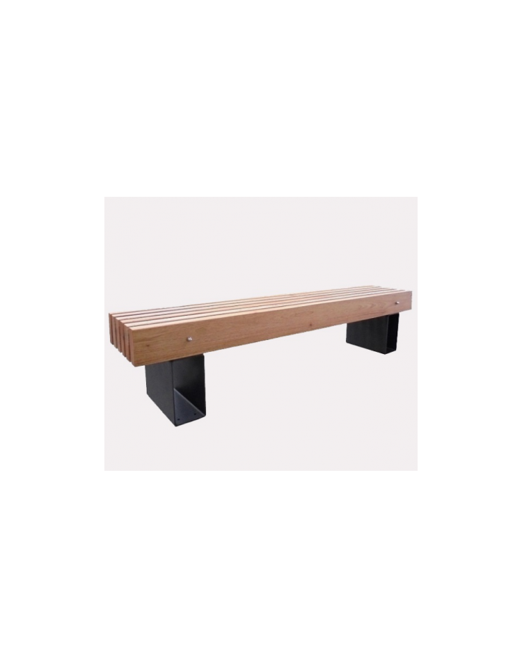 Panchina senza schienale dal design lineare e molto robusta. Realizzata con struttura in acciaio zincato e verniciato. I supporti sono realizzati in lamiera, sopra i quali viene fissata una piastra sagomata e forata per il distanziamento e fissaggio delle doghe in legno. La seduta è formata da doghe in legno di pregio. La viteria è tutta in acciaio inox. Con braccioli in acciaio zincato e verniciato